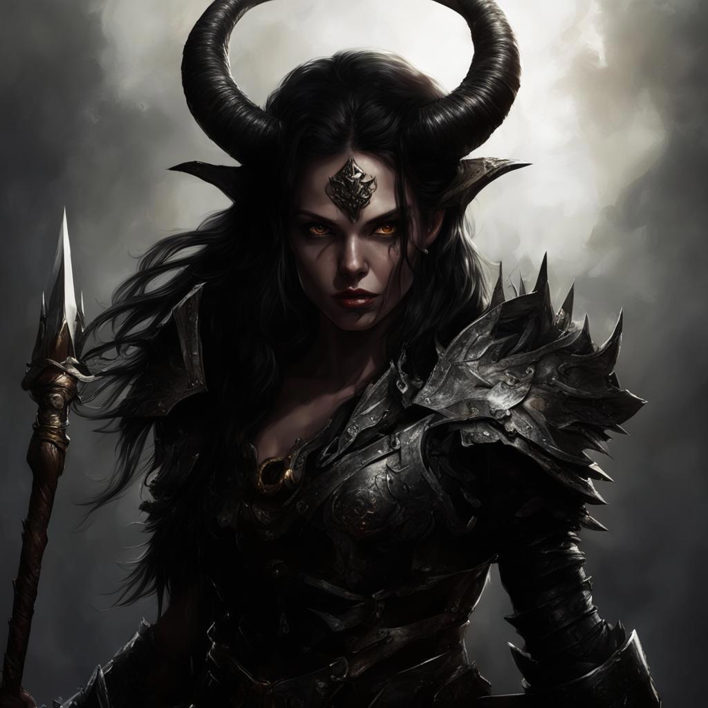 Я не очень разбираюсь в нейросетях, но если сильно уменьшить рога, убрать железку со лба, наконечник копья сделать алым и жуткий нагрудник заменить кожаной курткой, то она вот такая =). То есть я ее себе примерно такой и представляю.