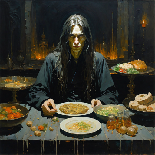 Чёрная худая фигура Кощея странно выглядела на фоне подушек с подсолнухами, и Варя пожалела, что не убрала их. Длинные чёрные волосы с серыми — не седыми — прядями, с вплетёнными в них красными, чёрными и металлическими бусинами, с серебряными и золотыми нитями, свесились на нездорового цвета лицо. Нос длинный, с горбинкой и широкими ноздрями. Скулы такие, что прикоснись — порежешься.