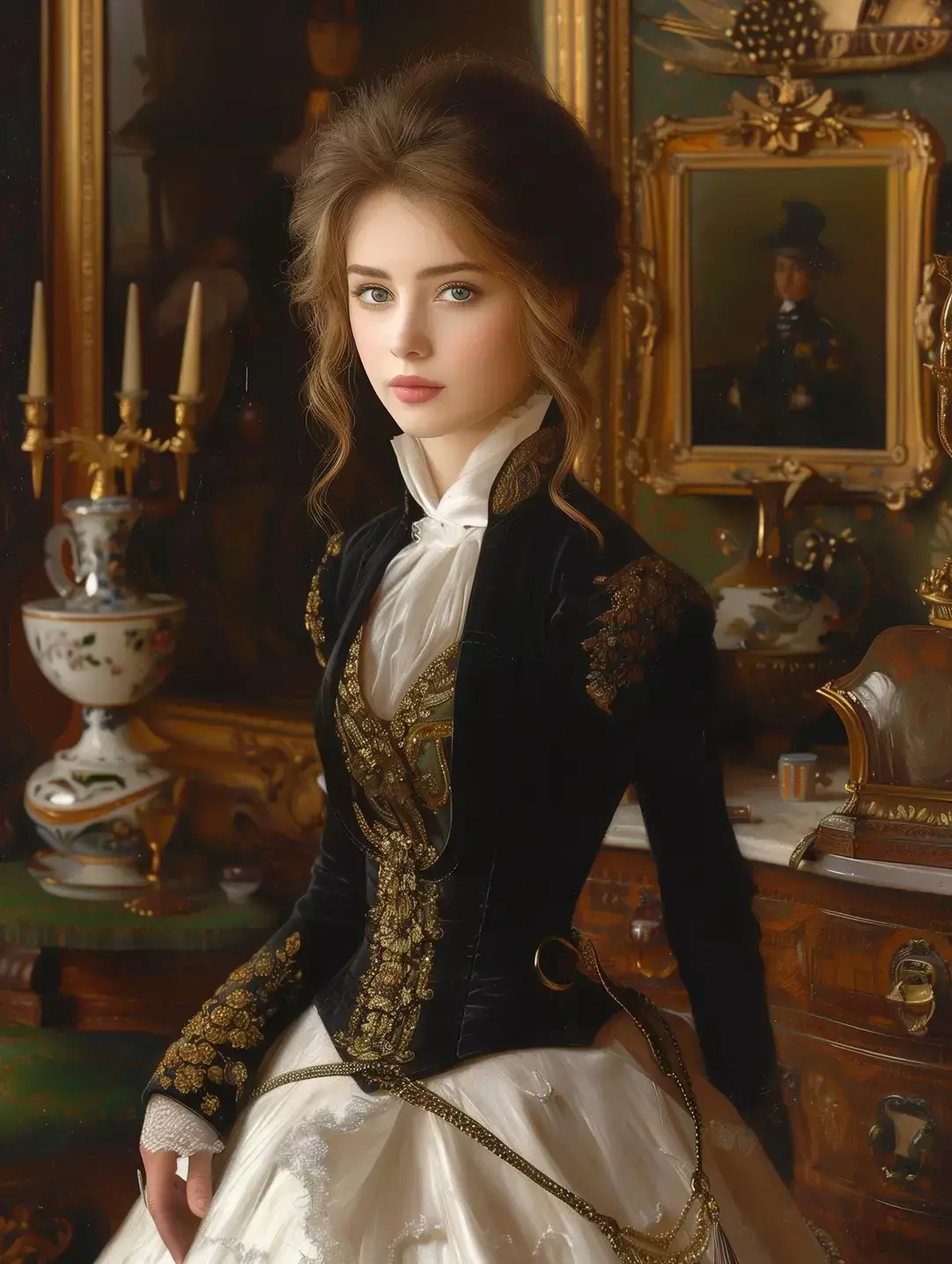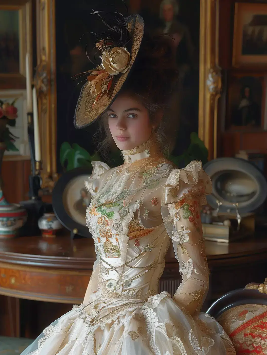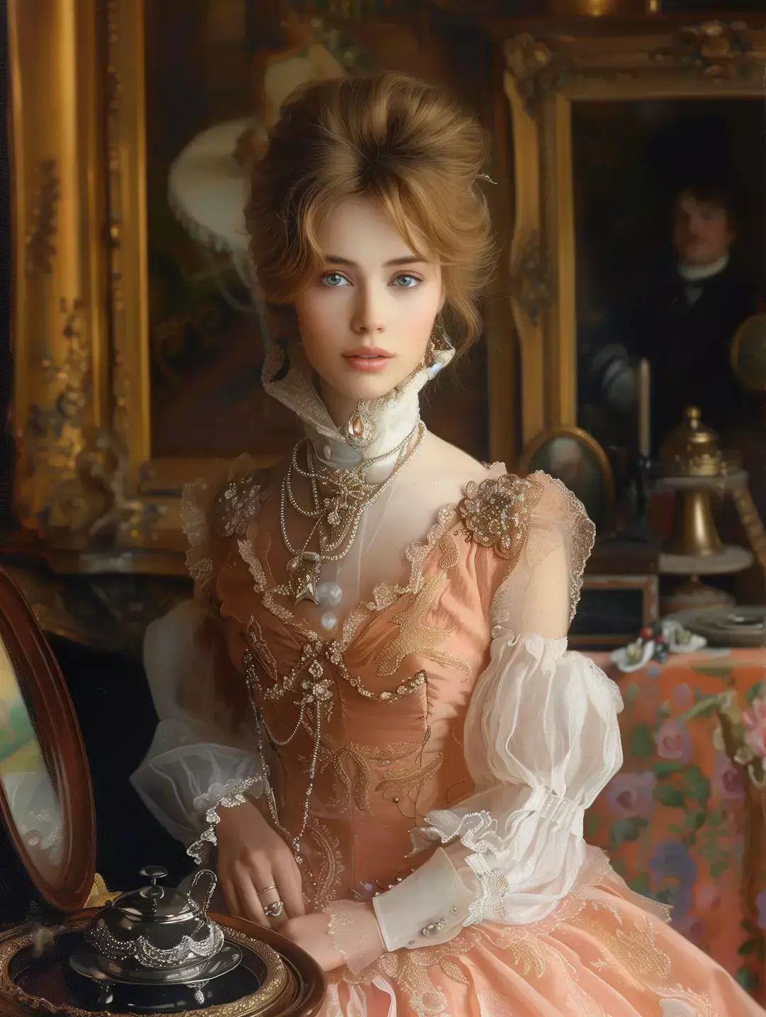 Молодая красивая богатая дама позирует в очень сложном салоне, где собран только лучший антиквариат и картины, лица Огюста Тулмуша