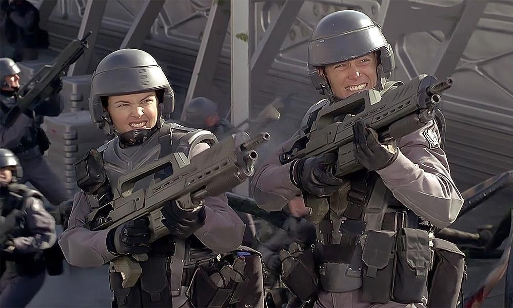 Начнём с азов: армия у людей потешная и абсолютно декоративная. Она полицейская по своей сути, её максимум - выступать миротворцами в каком-нибудь конфликте низкой интенсивности. Это прекрасно видно по вооружению солдат. У них даже пулемётов и гранатомётов в нормальном количестве нет, а уж техники и подавно. Ни одного тунчеса или БТРа в фильме не замечено, про артиллерию даже и говорить нечего. Весь звёздный десант это пехота с автоматами конца двадцатого века и в смешных шлемах с ушками.