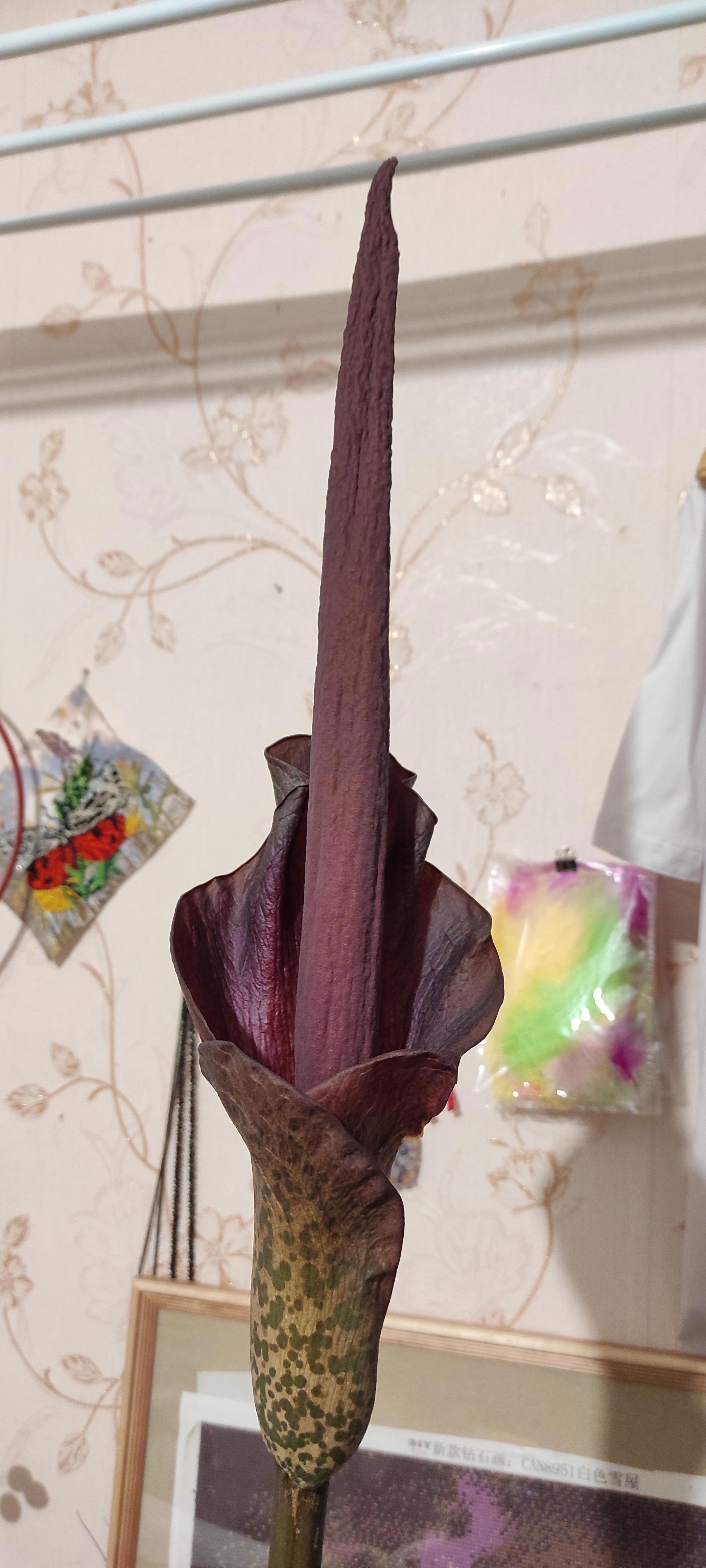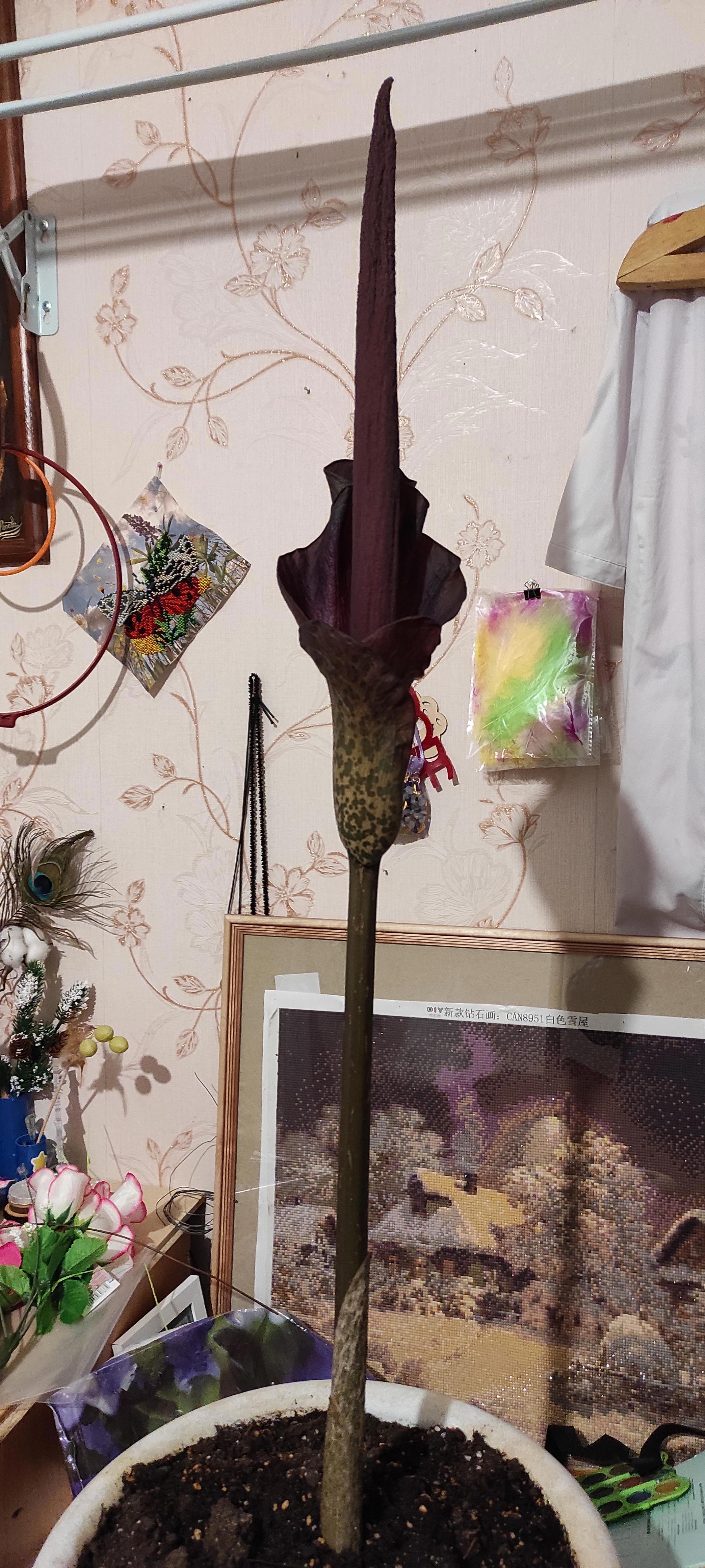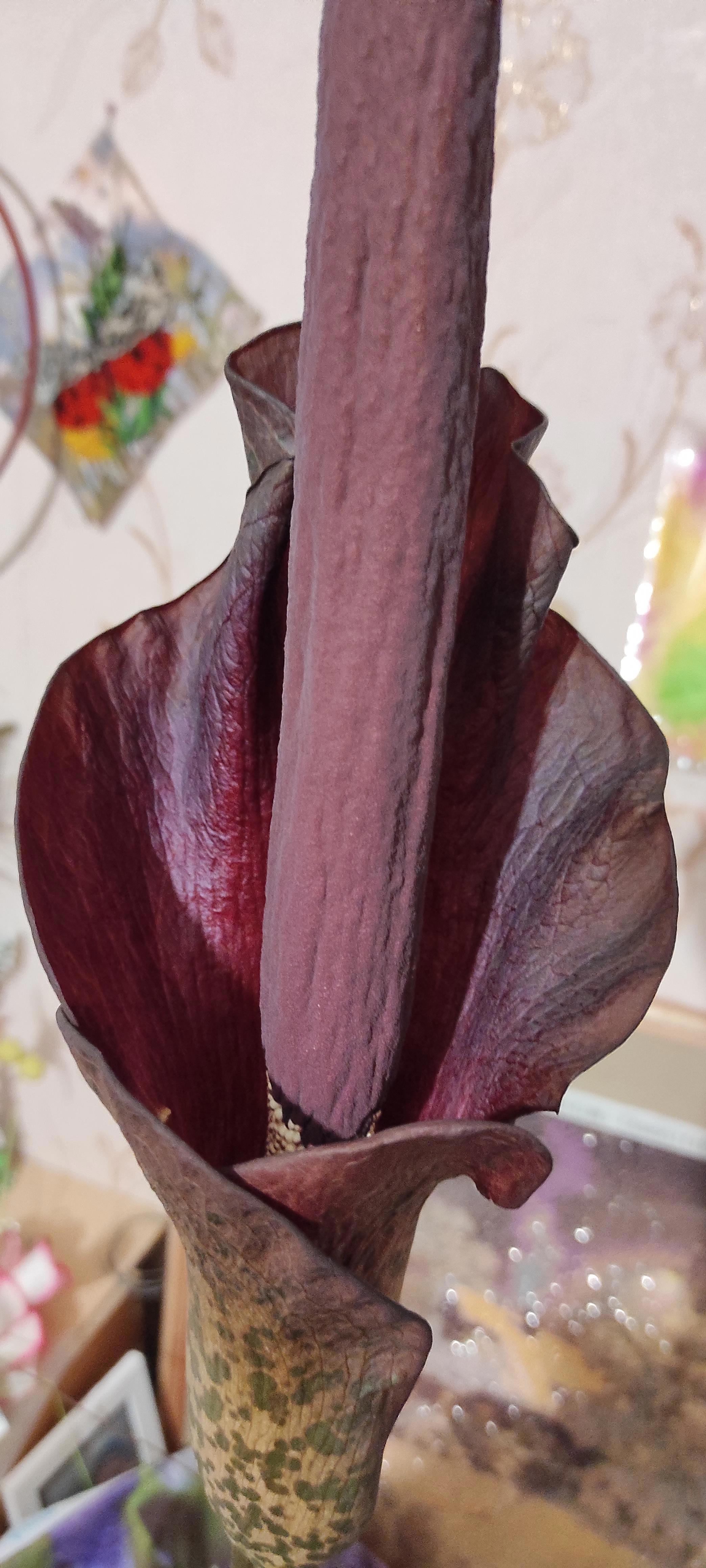 Вот такое чудо сейчас цветёт дома. Аморфофаллус. Высота цветка 83 см, клубню уже четверть века. Пахнет неприятно, но терпимо.