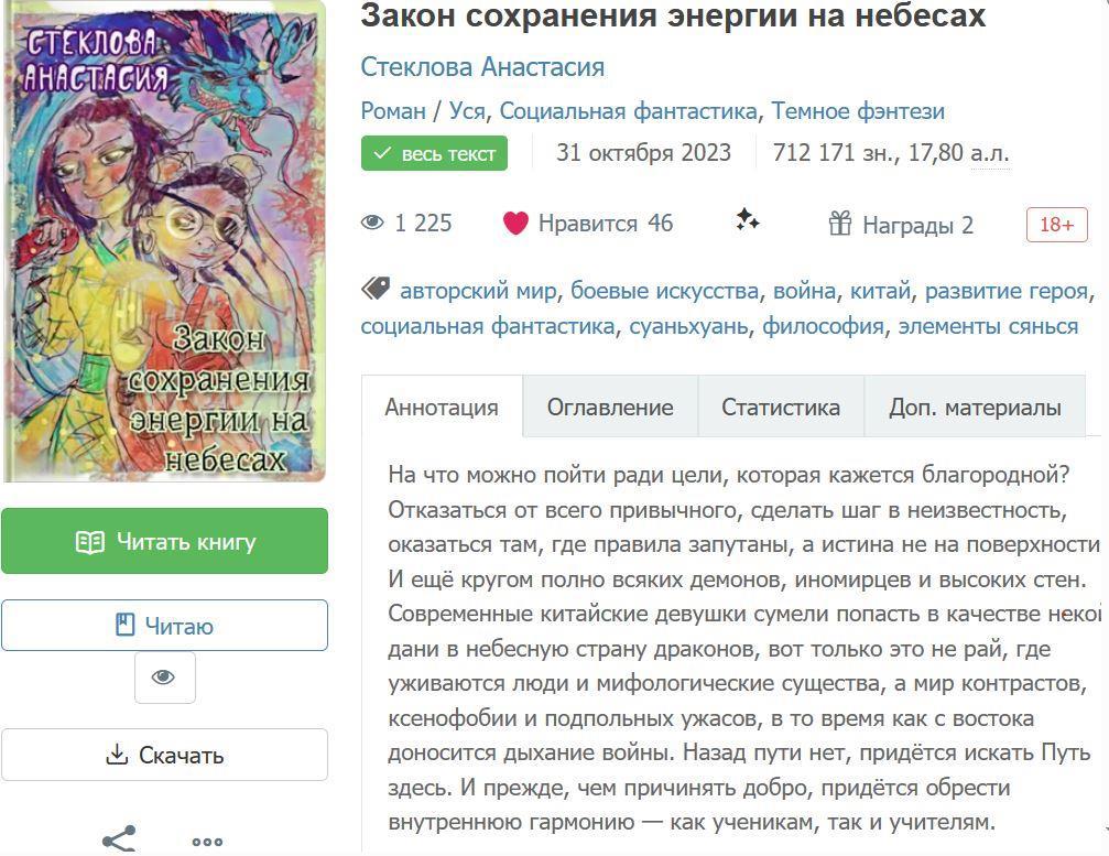 В остальном же, приключения девушек обещают быть увлекательными. Тут же по сути ещё и попаданки, возможны пересечения со славянской и японской мифологией, и вообще, кажется, что дальше дело пойдёт бодрее и веселее, но мне хватило. То есть у романа потенциал очень хороший, и идея интересная. Но тут либо серьёзно браться за его редактуру, либо посчитать это экспериментом, который дал определённый опыт и идти дальше.