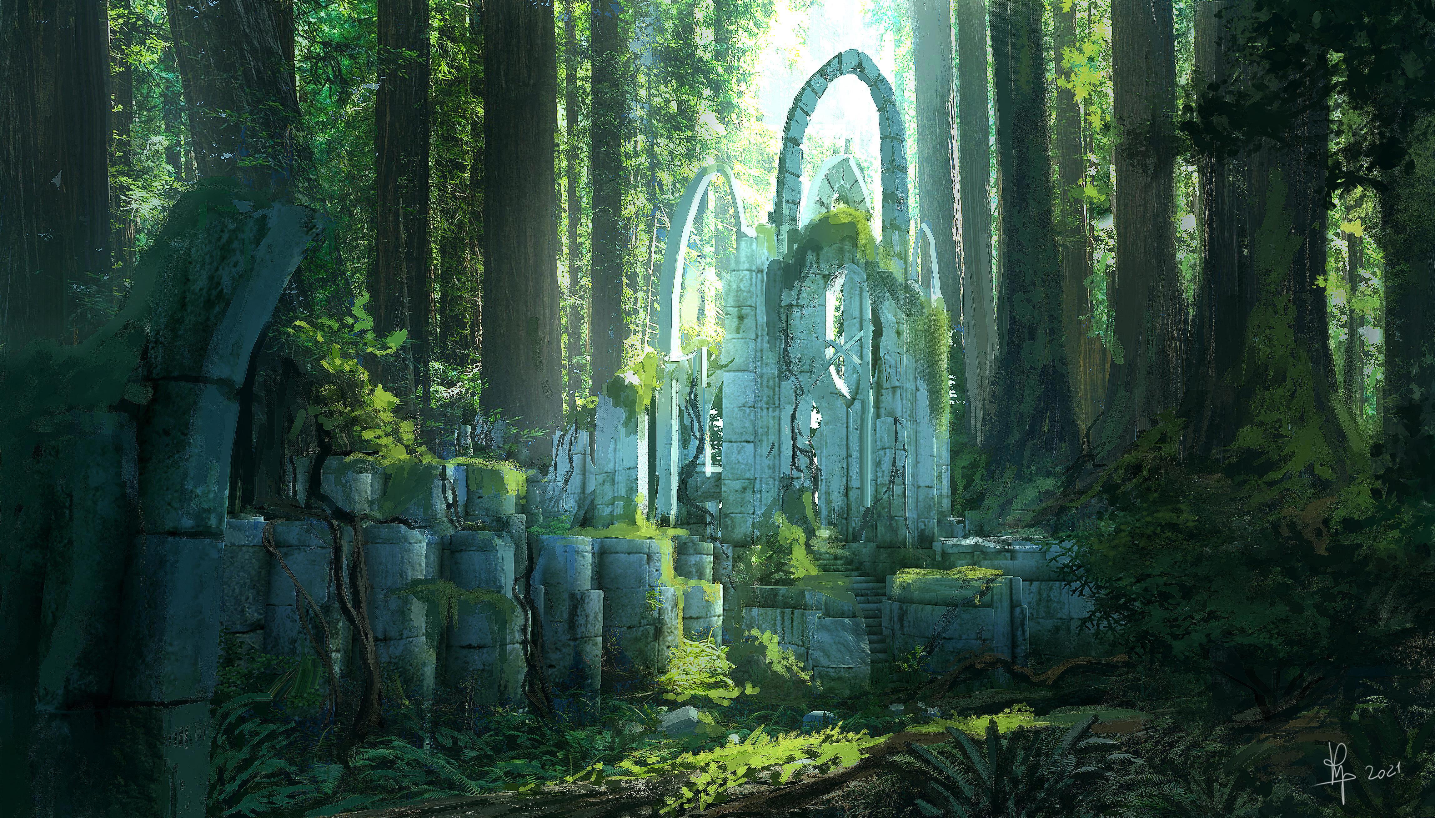 Несмотря на то, что каменные обломки, покрытые лозой и зеленью, скрываются в разросшейся лесной чаще, они всё ещё яркие от солнечного луча. От этого визуализации возникает чувство чужеродности, излишнего присутствия руин: природа ещё не приняла в свои объятия искусственное строение, предстоит ещё много веков, прежде чем архитектура растворится в зелёной жизни.