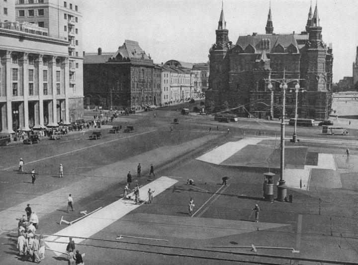 Маскировка Москвы. На всех площадях Москвы работали бригады женщин, наносивших разноцветные пятна на дорожное покрытие. Пятна имитировали крыши, какими их видят обитатели верхних этажей зданий. Позже, для большей реалистичности, к ним пририсовывали окна и тени в перспективе. Иногда, в разных местах города возникали макеты домов и целых деревень, которые постоянно перевозили с места на место. Все это делалось для того, чтобы сбить с толку немецких пилотов, которые ориентировались по объектам на местности. Пока краска сохла, все машины пускали в объезд.