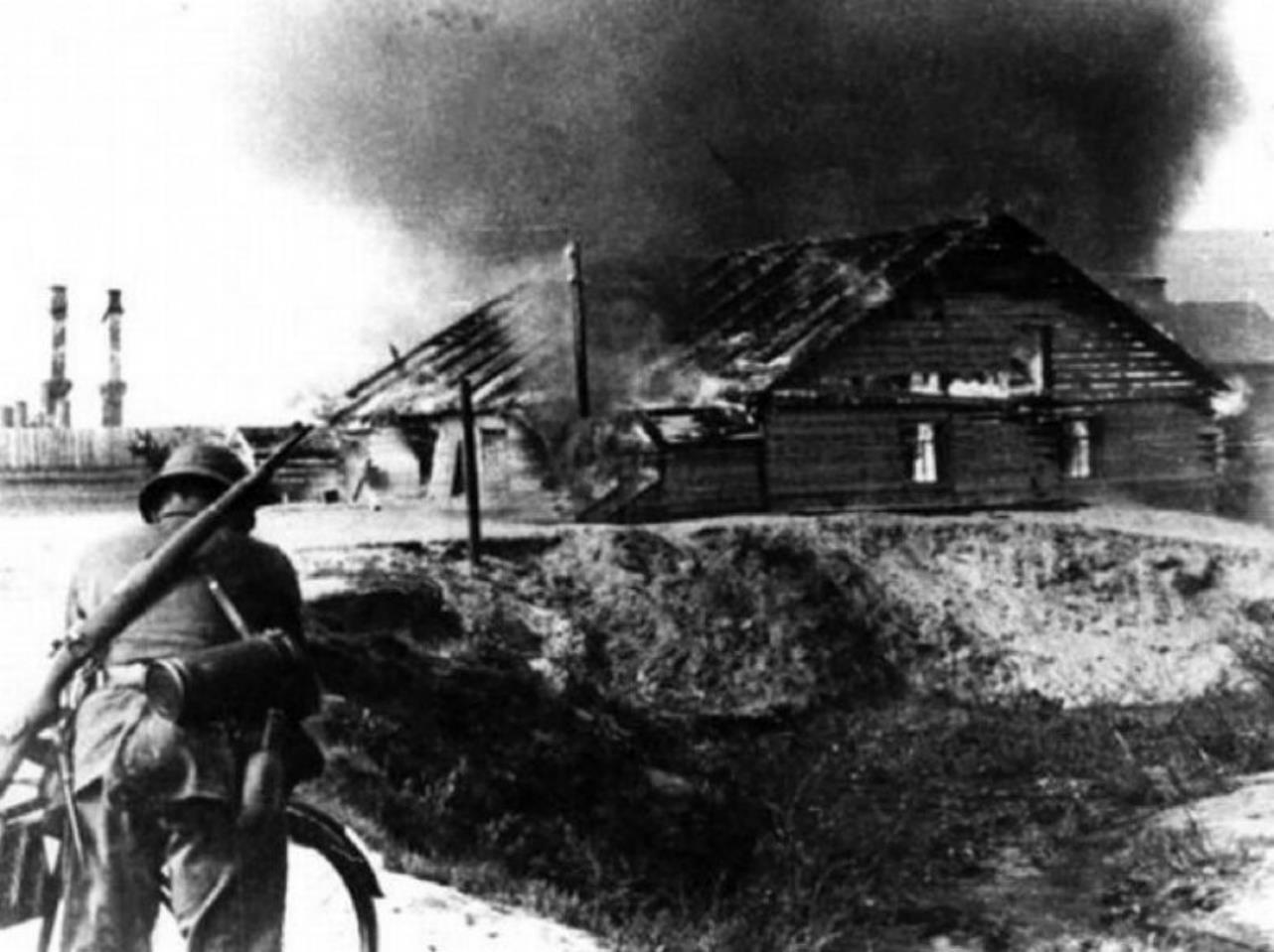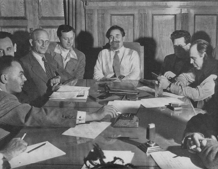 Пресс-конференция в Наркоминделе, на которой иностранным журналистам были продемонстрированы захваченные немецкие документы. Лозовский лично пригласил Бурк-Вайт и попросил не забыть взять с собой фотокамеру. Сразу после этого снимка раздался сигнал воздушной тревоги и все присутствующие побежали в бомбоубежище