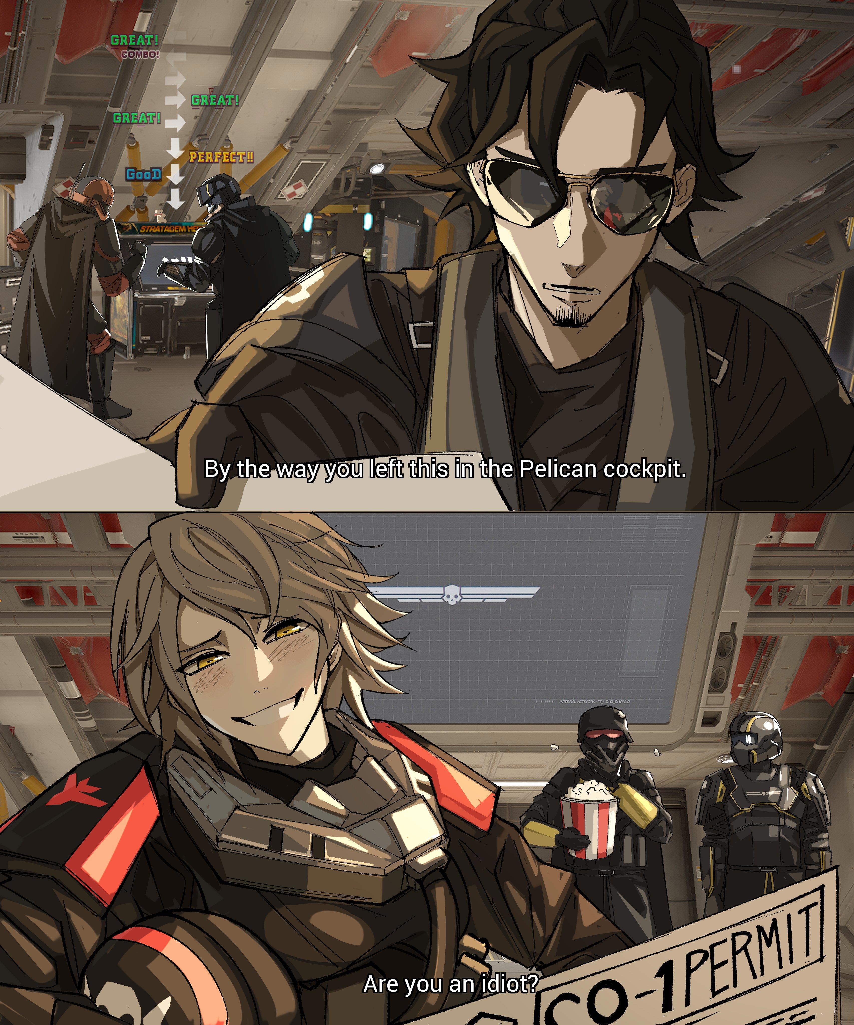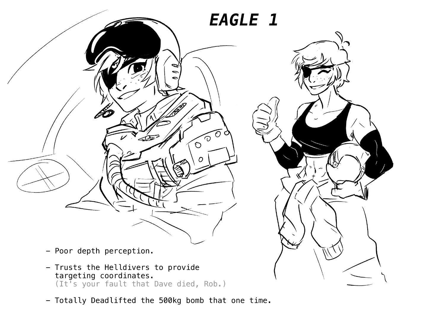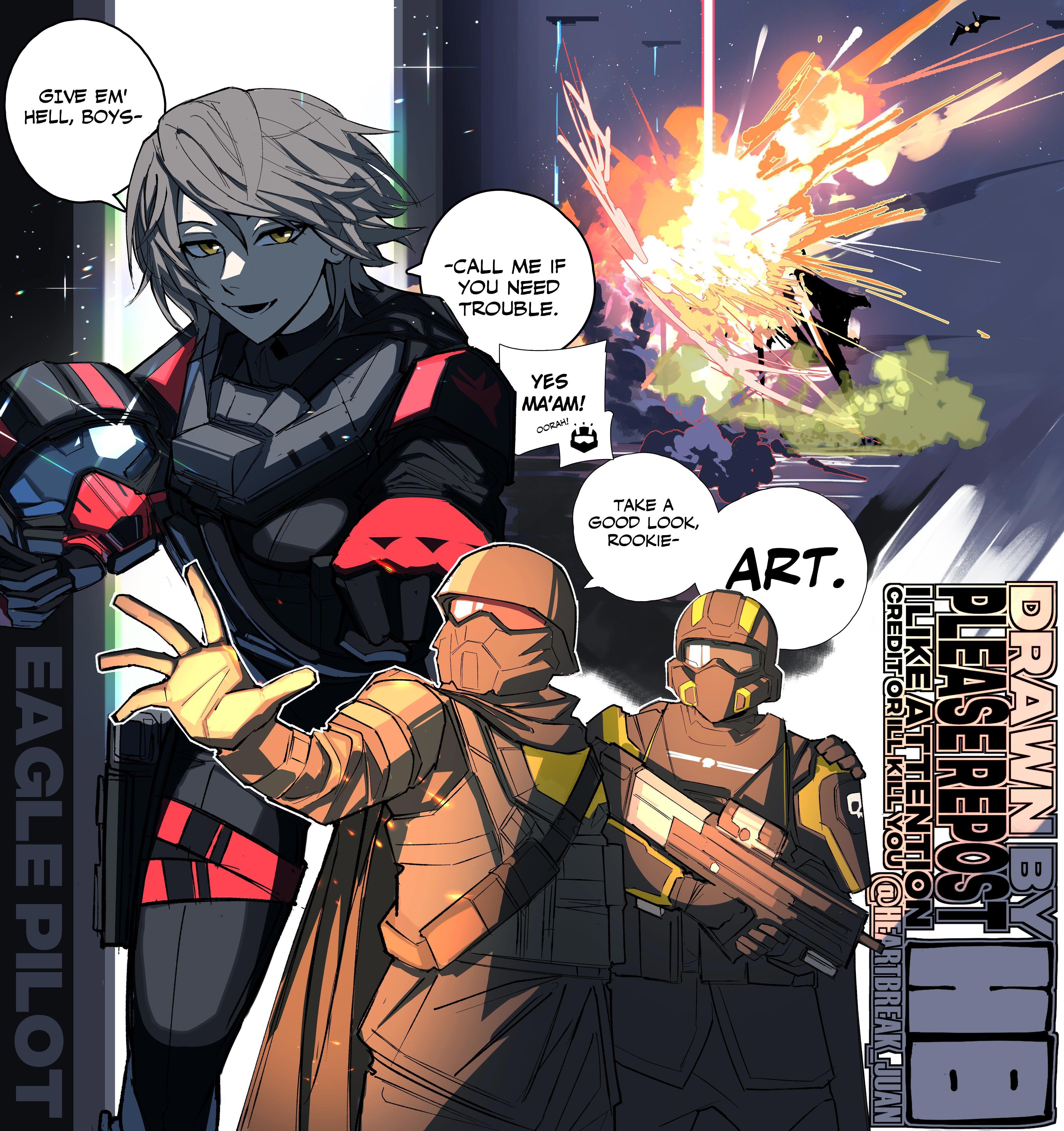 Автор: Руслан БирюшевКак мало фанатам надо для вдохновения! "Орёл-1" ("Eagle 1") - позывной пилота штурмовика, который поддерживает игроков в "Helldivers 2". Самолёт прилетает по вызову и кидает во врагов всякие штуки, какие укажет игрок. Но! У пилота женский голос. И этого достаточно. Потому что "Орлицу" любят все игроки - как её не любить в момент, когда она проносится у тебя над головой и роняет на орду твоих врагов 500 кг демократии? А среди миллионов игроков, конечно, есть и художники. Так что хотя в игре "Орёл 1" - это просто голос в наушниках и крылатая тень в небе, фанарт с лётчицей уже по сети гуляет, порой очень даже хороший. Лучшее - работы азиатского художника с ником иероглифами, но подником mi-24.