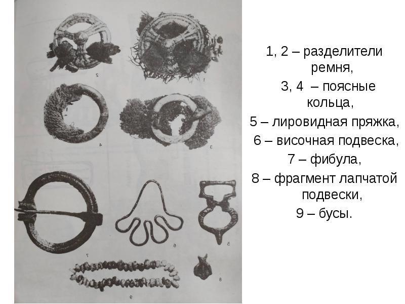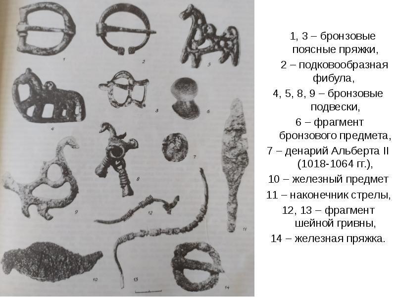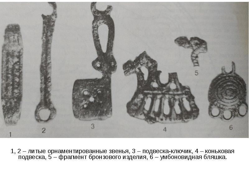 В одном женском захоронении сохранились фрагменты пояса с ножом, мехового головного убора и тканой одежды, украшенные бронзовыми подвесками и нашивками. У второй женщины было ожерелье из стеклянных бус, круглых бронзовых подвесок, часть из которых имела орнамент в виде процветшего креста. У левого колена мужчины лежал рукоятью вверх железный рабочий топор . Все три погребения рассматривались О. В. Овсянниковым как одновременные и датированы по вещам концом XII — началом XIII века. Этот вывод подтвердило радиоуглеродное датирование образцов органики, взятых из двух погребений .