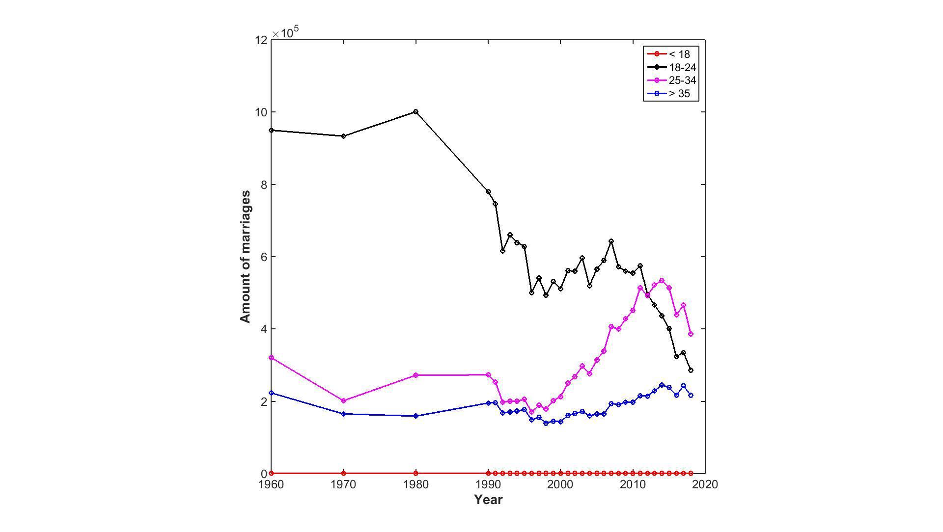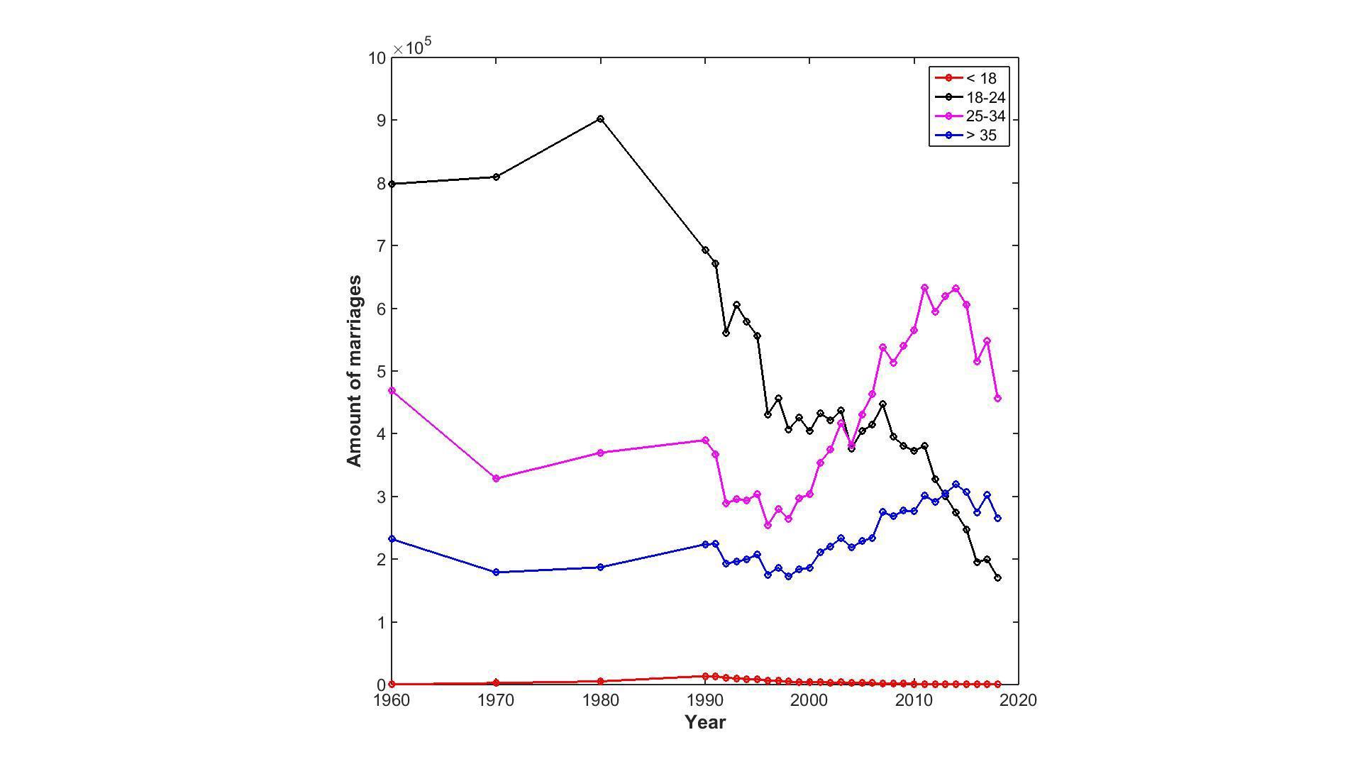 3. Возраст мужчин при заключении брака. Мужики стареют, откладывают. До 18-и вообще никто не женится.