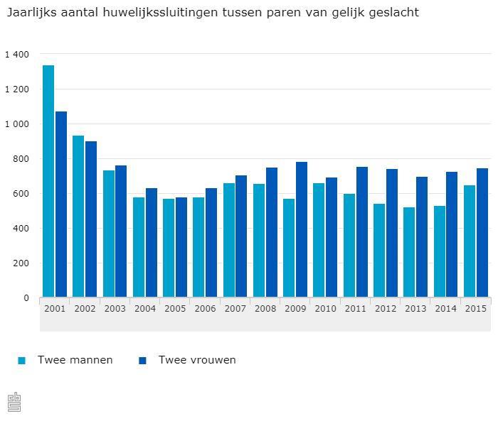 5. Количество браков. Светлые - мужчины с мужчинами, темные - женщины с женщинами. Женщины плавно перещеголяли мужиков за последние 15 лет существования гей-брака.