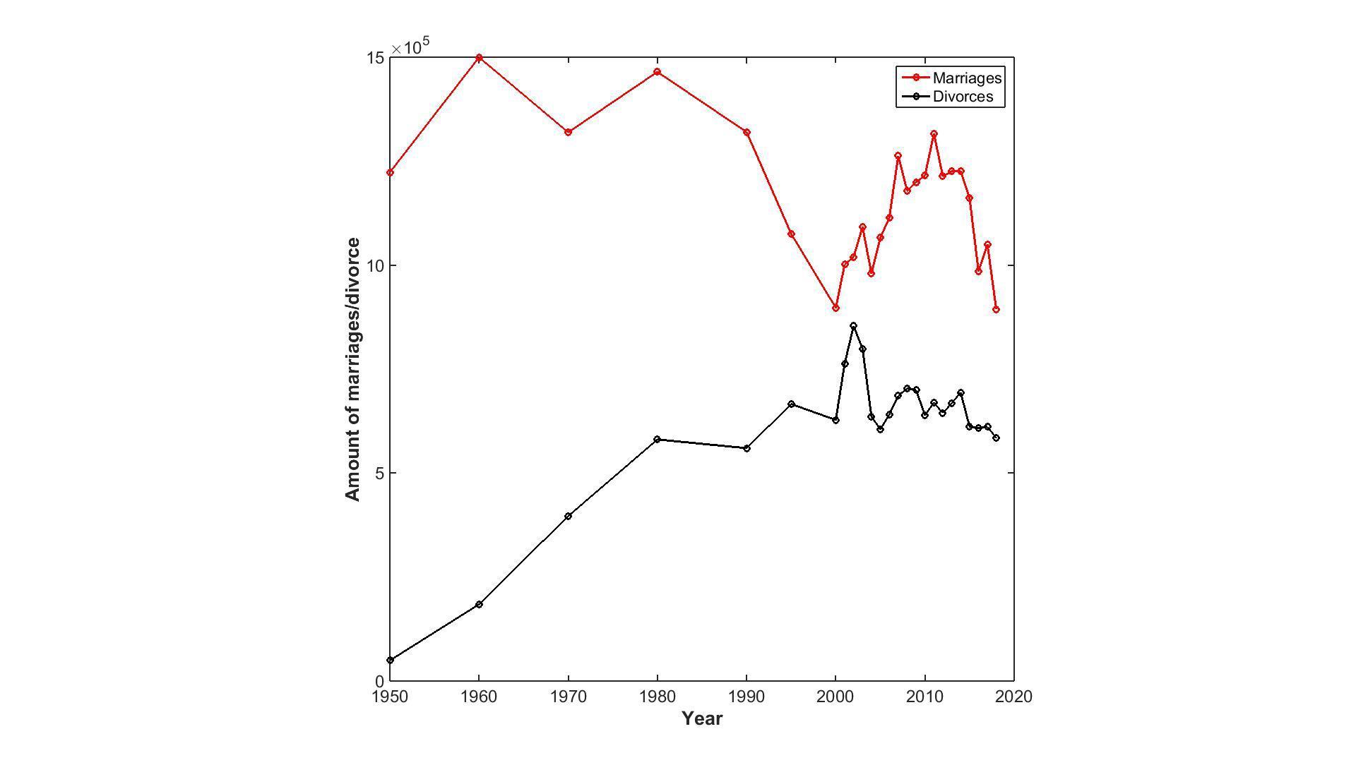 Ну мы, ученые на слухи не ведемся. Я честно скачала всю статистику браков и разводов у официального источника и пошла строить графики. Внимание, инфа!