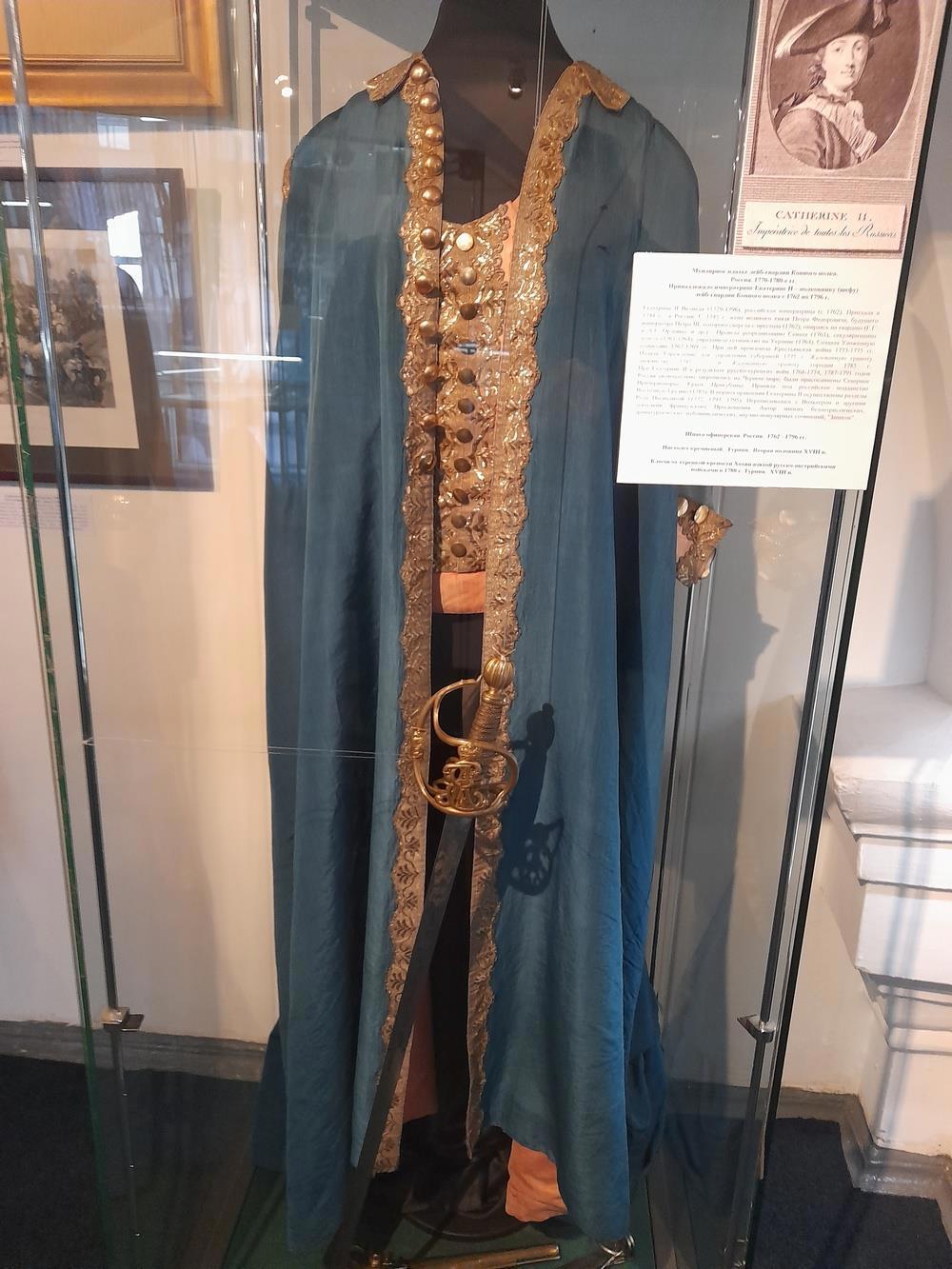 Так сложилось, что императрице не пришлось самой отстаивать от толп врагов ни Эрмитаж, ни Китайский дворец, ни прочие свои объекты недвижимости. Даже немножко жаль - интересно было бы как это потом изображали. А я даже немножко размечтался, тем более, что и фантазировать не надо - вот нагината, вот военный мундир императрицы Екатерины Второй: (точнее все же мундирное платье, так-то она в штанах смело по-мужски скакала на лошадях и выступала перед гвардией, но по статусу - таки ей как шефине ряда полков полагалось все же офицерское платье. И да - шпага таки при платьи все же не ее.)