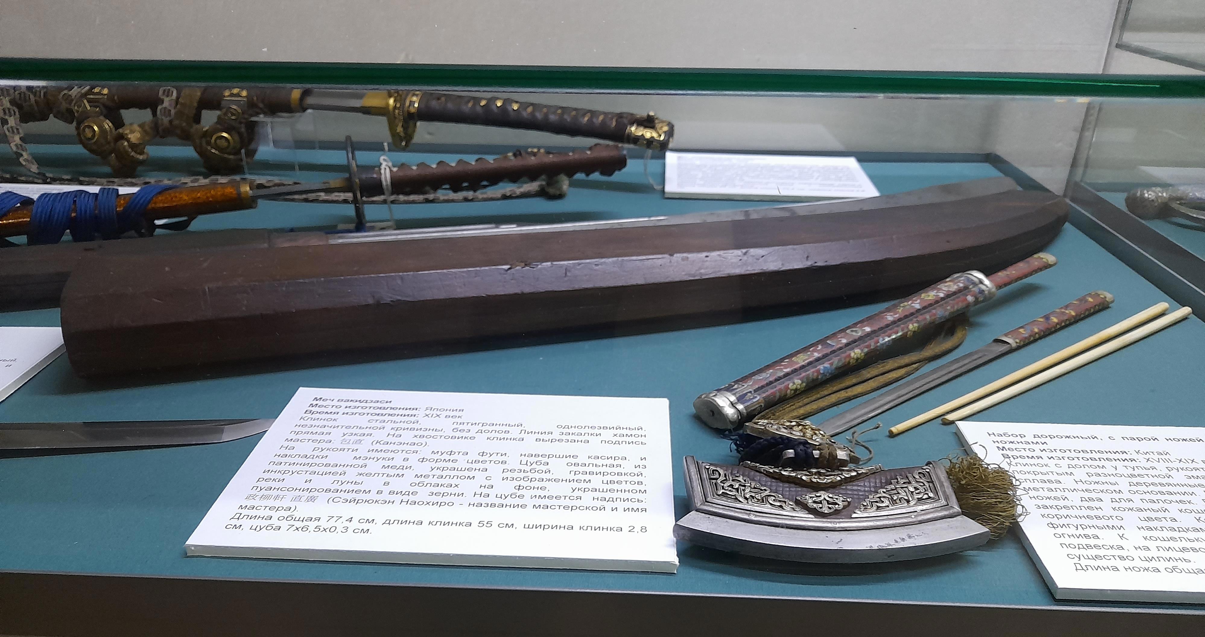 Ниже ножен и правее - дорожный несессер: вилка с лож..., то есть извините, палочки для покушать и ножики в футляре, а так же кошелечек, чтоб купить это самое покушать.