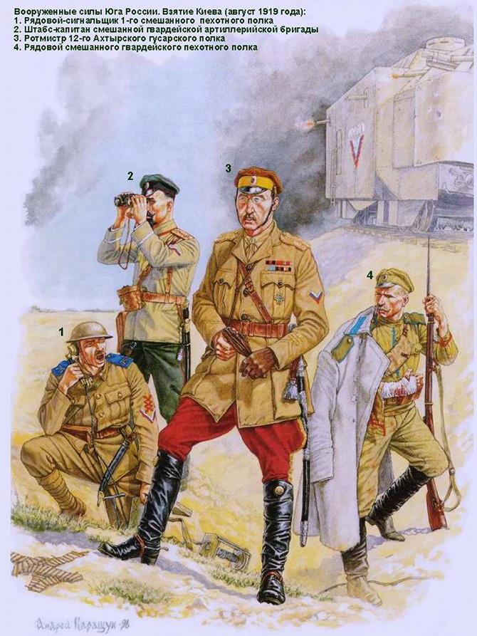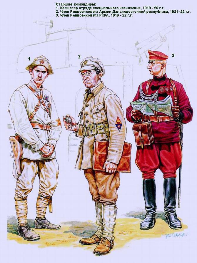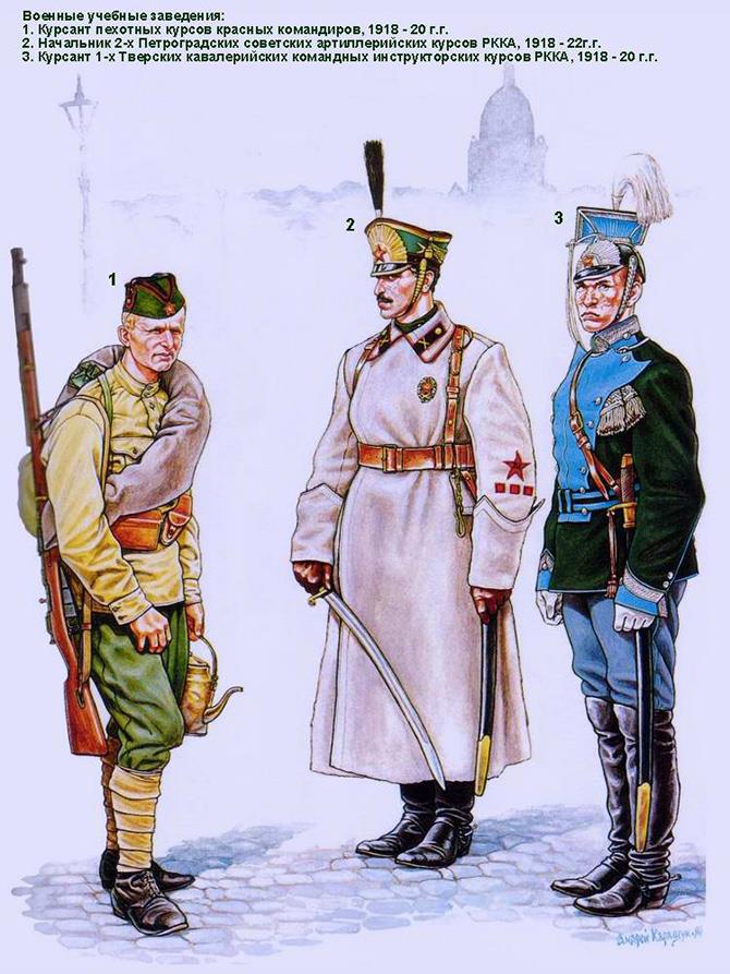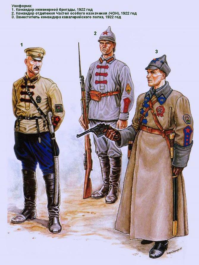 В лучших традициях анархии и вседозволенности первых месяцев советской власти смешение различных предметов униформы приводило к всевозможным курьезам. Например, курсанты инженерных курсов носили юнкерские мундиры с киверами, на которых царские орлы были закрыты суконными красными звездами, причем все это "чудо" носилось вместе с защитными брюками. Также в Красной Армии имелся ряд подразделений, носивший комплекты гусарской униформы.