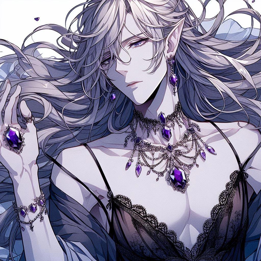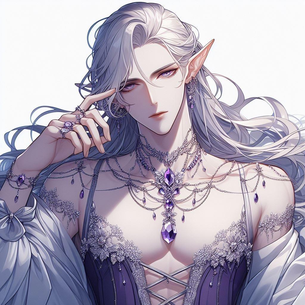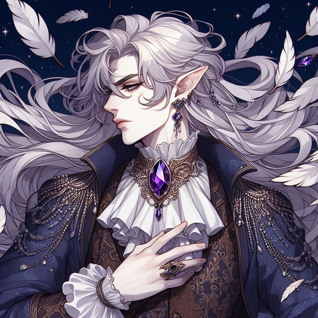 парень, эльф, серебристые длинные волосы, бледная кожа, роскошный камзол, украшения, аметисты, ракурс сверху