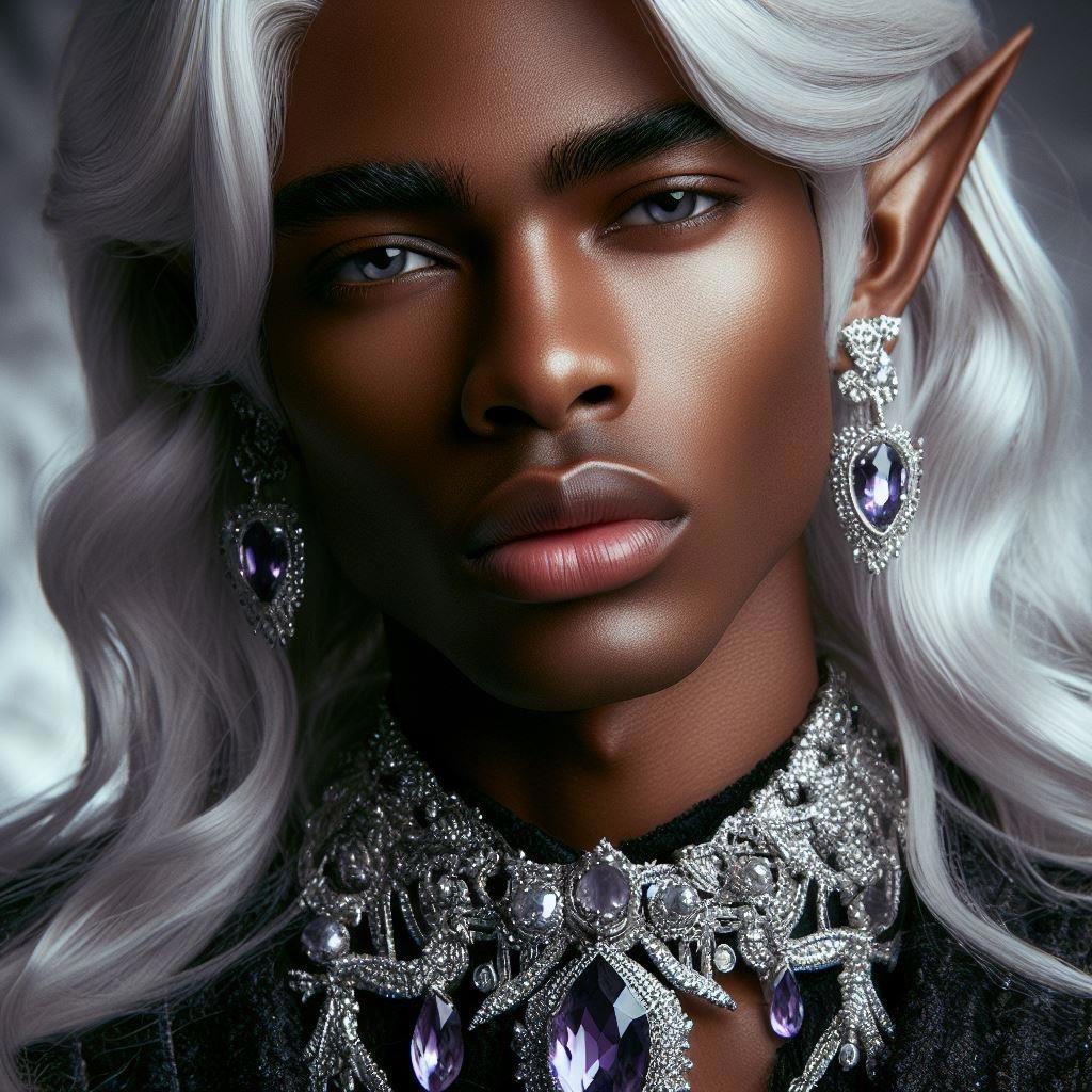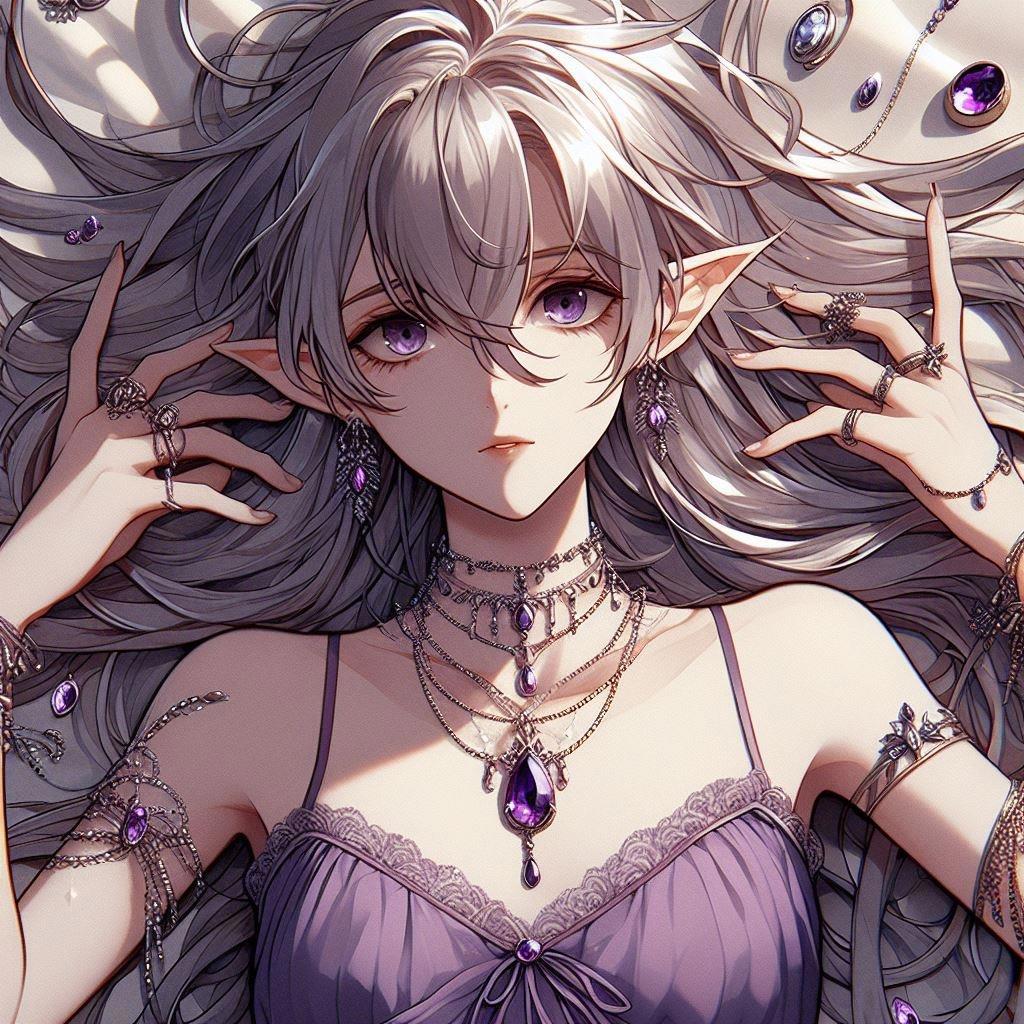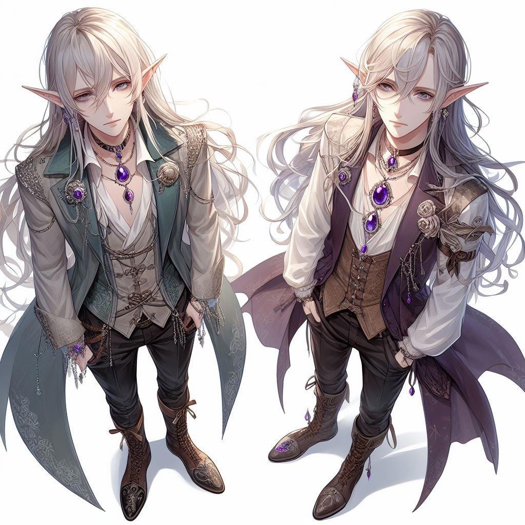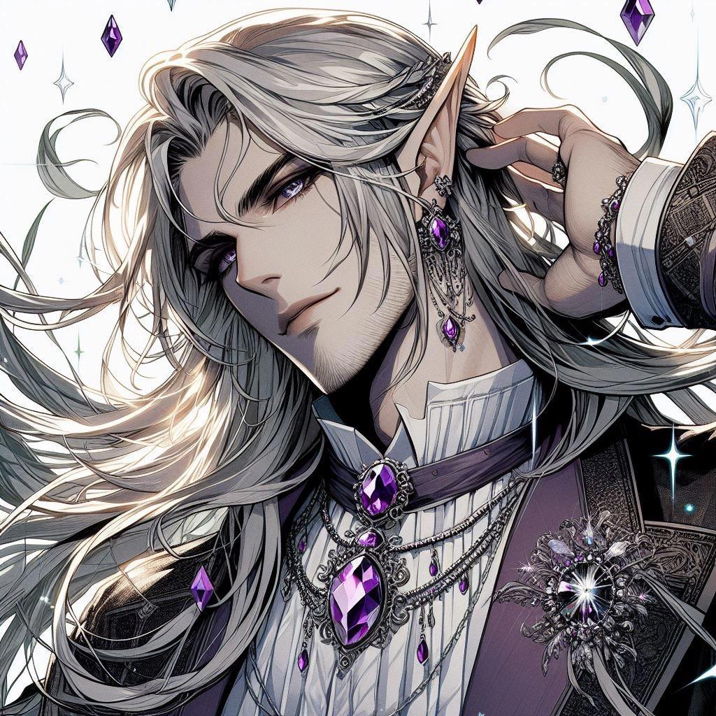 парень, эльф, серебристые длинные волосы, бледная кожа, роскошный камзол, украшения, аметисты, ракурс сверху