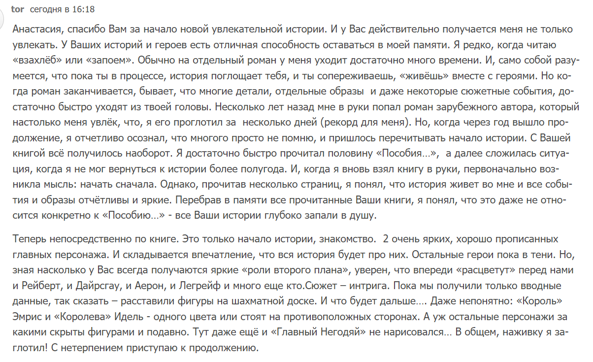 Одним из таких читателей является tor (он же "мистер Д" в моей голове), отыскавший меня когда-то на Продамане, а затем переехавший за мной с Продамана на АТ. И сегодня после долгого перерыва я получила от него прекрасный развернутый комментарий, которым просто не могла не поделиться. В нем 2 части, и для автора важны обе. Но если вторая касается непосредственно книги, на которую он был написан ("Наследие Греймхау", если что), то перввая - это то, что букально растопило мое трепетное сердечко :)))