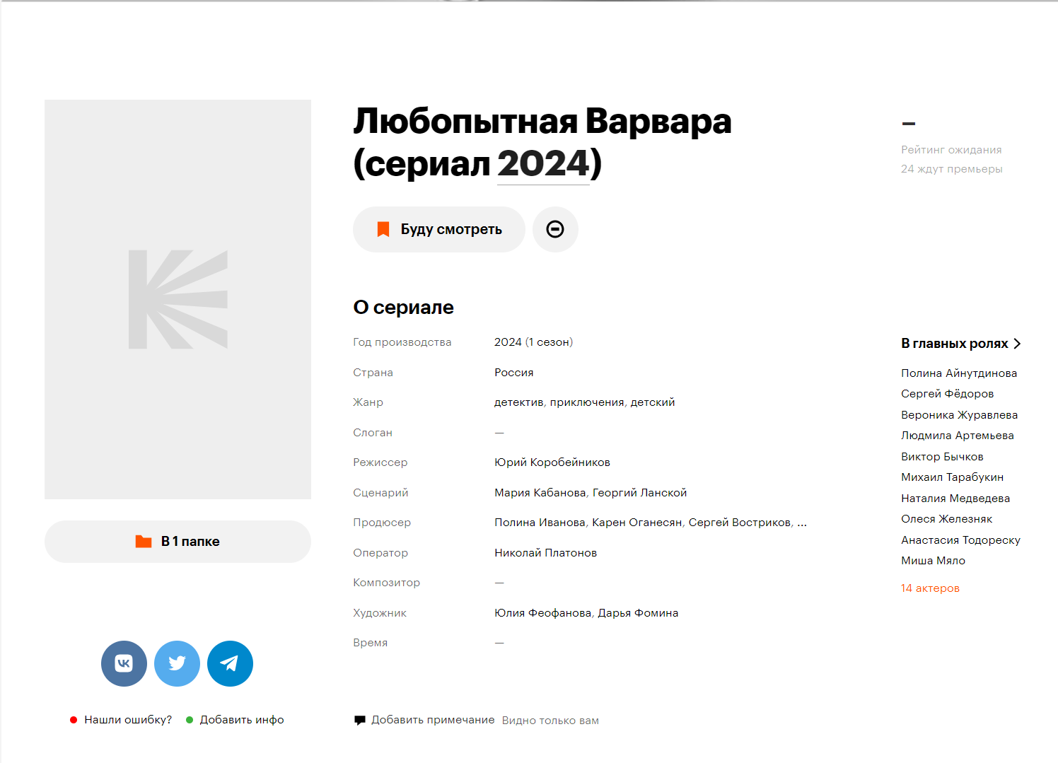 Мне очень интересно, что там будет в итоге. Очень нравится каст - Артемьева, Железняк, Медведева, Бычков, Тарабукин... От сюжета книги, я так полагаю, ничего не осталось, так что читателям я заранее советую рассматривать это как два отдельных произведения.