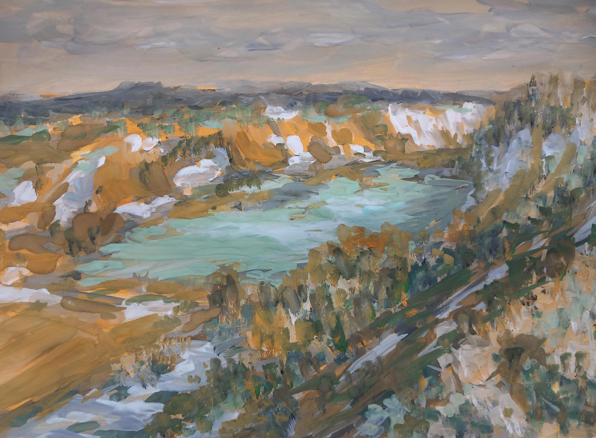 Для начала написала небольшую картинку гуашью, четырьмя цветами: охрой, светло-зелёным, белым и чёрным. Кто бы знал, что из четырёх цветов, смешивая их, можно получить 15 цветов!