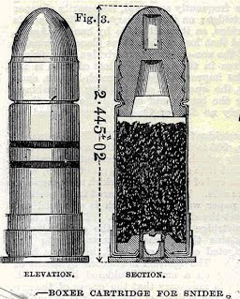 Автор: Андрей УлановИзображение 1872 года патрона Boxer для британской винтовки Снайдер-Энфилд с полым наконечником, который, как известно, вызывал сильное расширение и фрагментацию при попадании в цель. Источник: «Оружие войны V: стрелковое оружие с казенной частью», том. 1, Касселл, Лондон, 1884 г., с. 272.