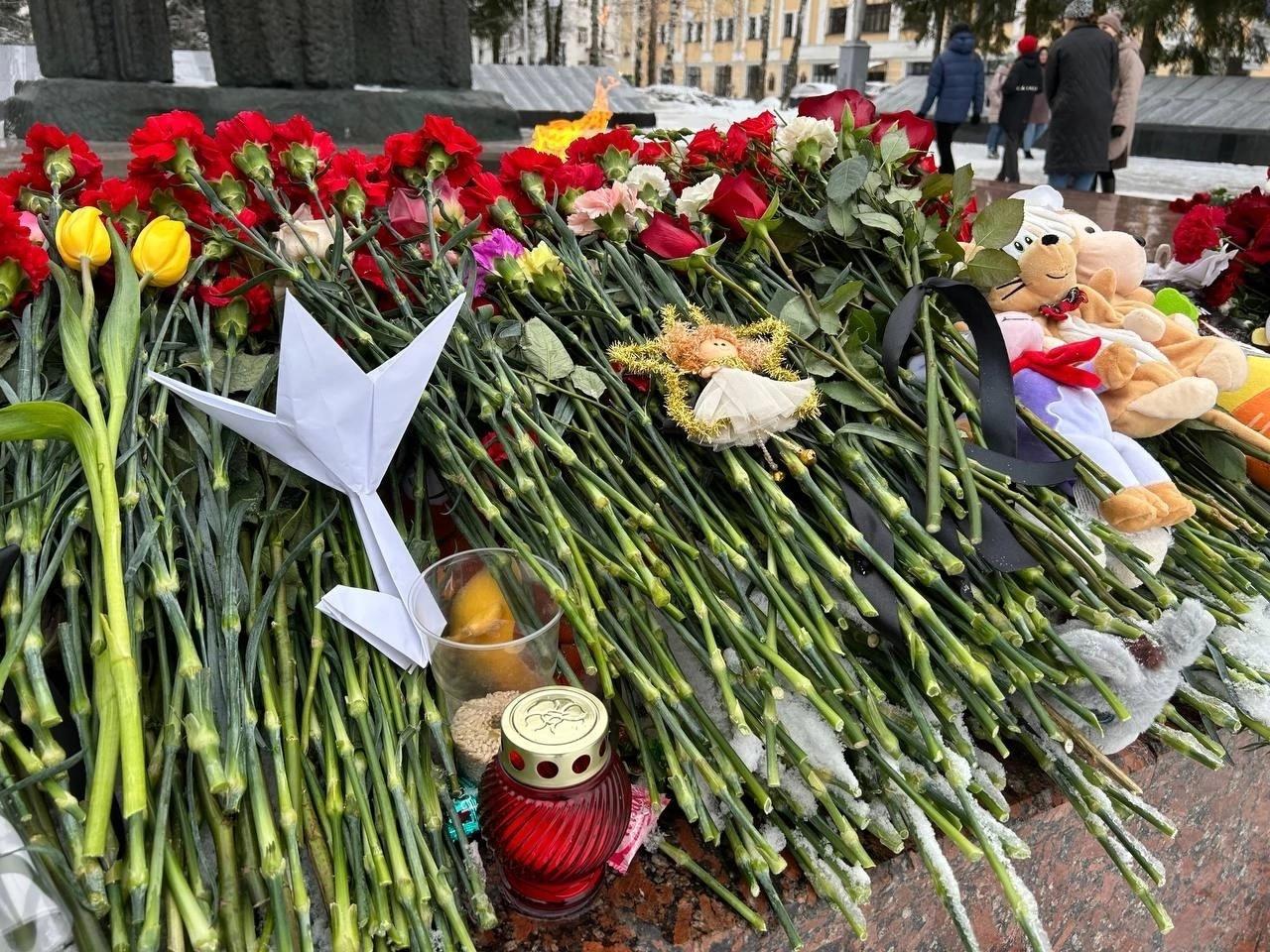 Сегодня утром я шла на работу мимо вечного огня у нас в городе. Вчера дети нашего города рисовали и делали оригами-крокусы. Крокус или шафран символизирует надежду и возрождение, поскольку большинство его видов зацветает, когда земля еще покрыта снегом. Вот так выглядит наш вечный огонь: