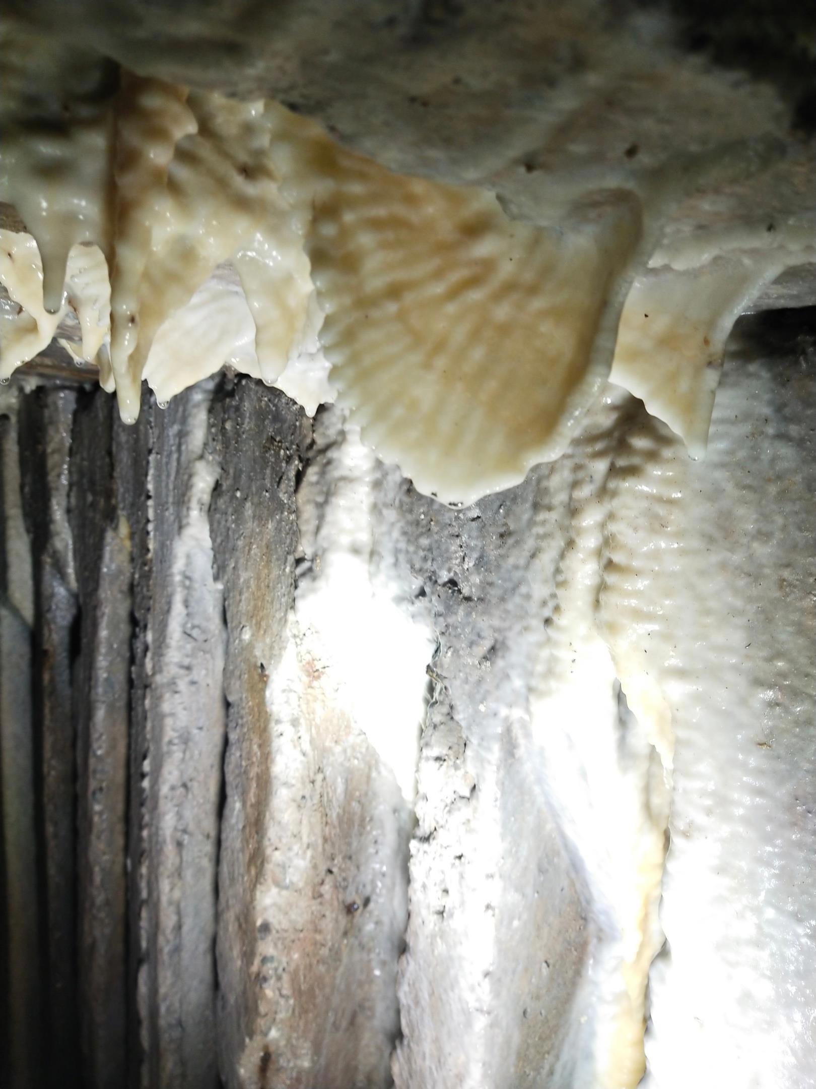 Вот, всё это очень хрупкое, наступать страшно. Правда, Александр говорил, что наступать можно без боязни, ещё нарастёт красивее прежнего, но всё равно жалко. Разглядывать все эти наплывы, россыпи пещерного жемчуга внутри чаш можно долго. Ну, пока спина не начнёт отваливаться. На потолке, кстати, не менее красиво. Вот, например, зубастый гребешок, об который на обратной дороге я здорово ушибся башкой. Слава, богу, не сломал.