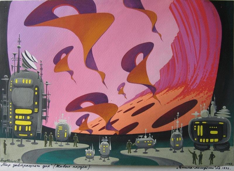 Иллюстрация «Живые паруса» из серии «Мир завтрашнего дня» выполнена в космическом стиле. Его работы не слишком детализированы и весьма не строги к исполнению НФ-канона, но насыщены приятным оптимистическим цветом и создают очаровывающий вид на лучшее будущее, полное доброго авантюризма и прогрессорства.