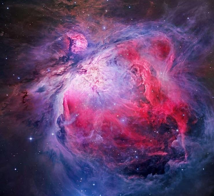 Подробности, какие удастся рассмотреть, сильно зависят от апертуры телескопа, а цвет туманности -- еще и от условий наблюдения. Вообще-то протяженные небесные объекты при визуальных наблюдениях чаще всего бесцветны. Исключений мало -- скажем, зеленоватый цвет "Гантели" (М27). А М42 -- загадочный объект. Любители астрономии на форумах спорят и даже собачатся: цветная она или нет? А я скажу: это как повезет. Мне ОДИН раз повезло увидеть М42 в ярком цвете, и случилось это не где-то в южных горах, а в Подмосковье (правда, в исключительно прозрачную ночь). Феерия! Этакая птица с пурпурными крыльями. А в ней Трапеция Ориона -- система из 4 молодых звезд. Вообще-то их там не менее 9, но не все хорошо видны.