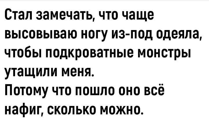 Смешно... Но ногу из-под одеяла я тоже часто теперь высовываю! Не смотря на накроватных монстров с острыми коготками!