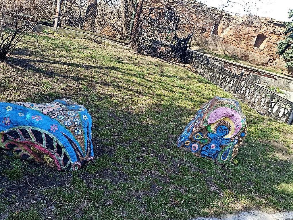 На заднем дворе ученики соседней с кармелитами художественной школы разрисовали камни акрилом: