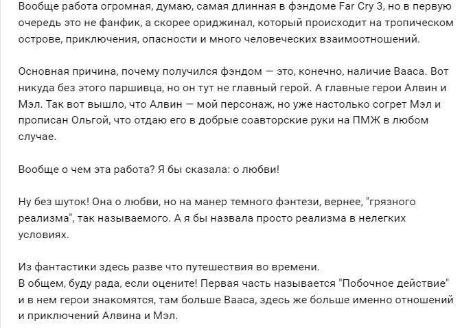 Наверное, стоит немного пояснить, что это за текст, и почему с ним всё сложно. Если заглянуть в "шапку", можно заметить, что работа вроде как фэндомная, по здешним меркам фи-фи-фи, "у афтара своих мозгов нет", но в случае с ЦЛ ситуация с самостоятельностью написанного очень непростая. В общем, если коротко, когда-то я имела неосторожность начать роман, героиня которого отказалась со мной дружить. Я чуяла, что тётка она, в общем-то, неплохая, при том, что ведёт себя отвратительно, но раскрываться она не хотела. И тогда я отложила начатое в долгий ящик и, как вы думаете, что сделала? А то и сделала, отправила дамочку "в отпуск" в самое трэшовое место, которое в тот момент попалось мне на глаза. В итоге получилось... что получилось. Трэш разросся до приличных (мягко говоря) размеров, героиня нашла себе мужика в виде персонажа соавтора, к этим двоим подгребла целая толпа вымышленных нами же с соавтором чуваков, каждый из которых оброс своей историей, вся толпа прошла через тропический адище. Да, этот адище был игровой, но проработать его в совокупности с собственным материалом было невыразимо трудно.