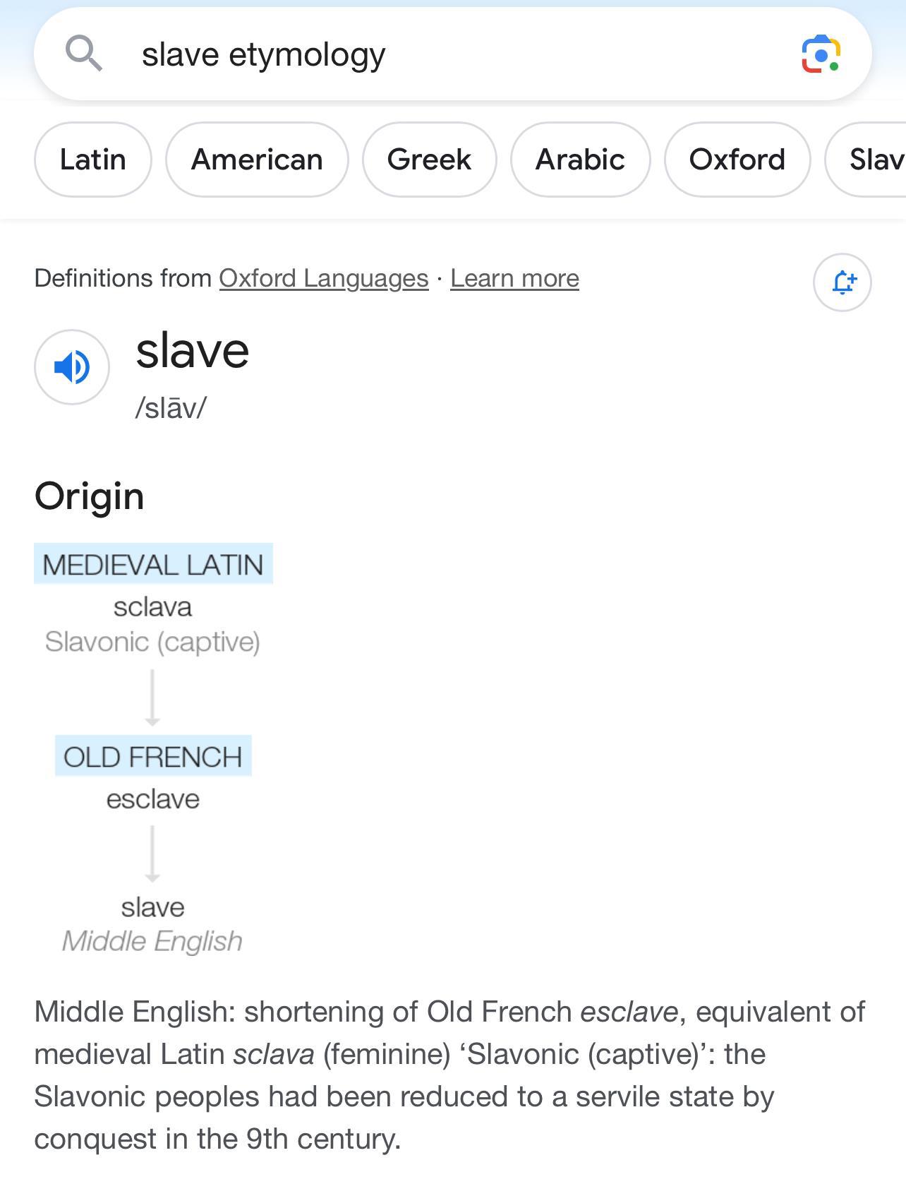Официальное объяснение утверждает, что в Византии было так много рабов-славян, что Славянин стало синонимом слова Раб.