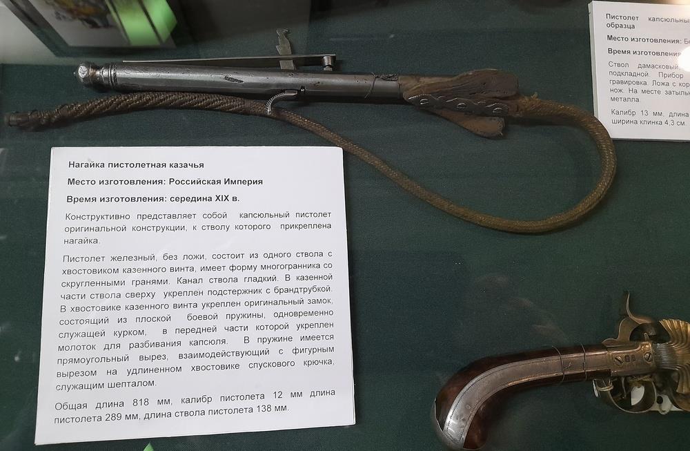 Ну и на закусь еще одно средство для рукопашного боя - пистолет нагайка - это уже отечественное. Внизу ручка пистолета-кортика. В кончик нагайки вплетен кусочек свинца - и по удару он глде-то пуле подобен, видал я пользование такой нагайки.
