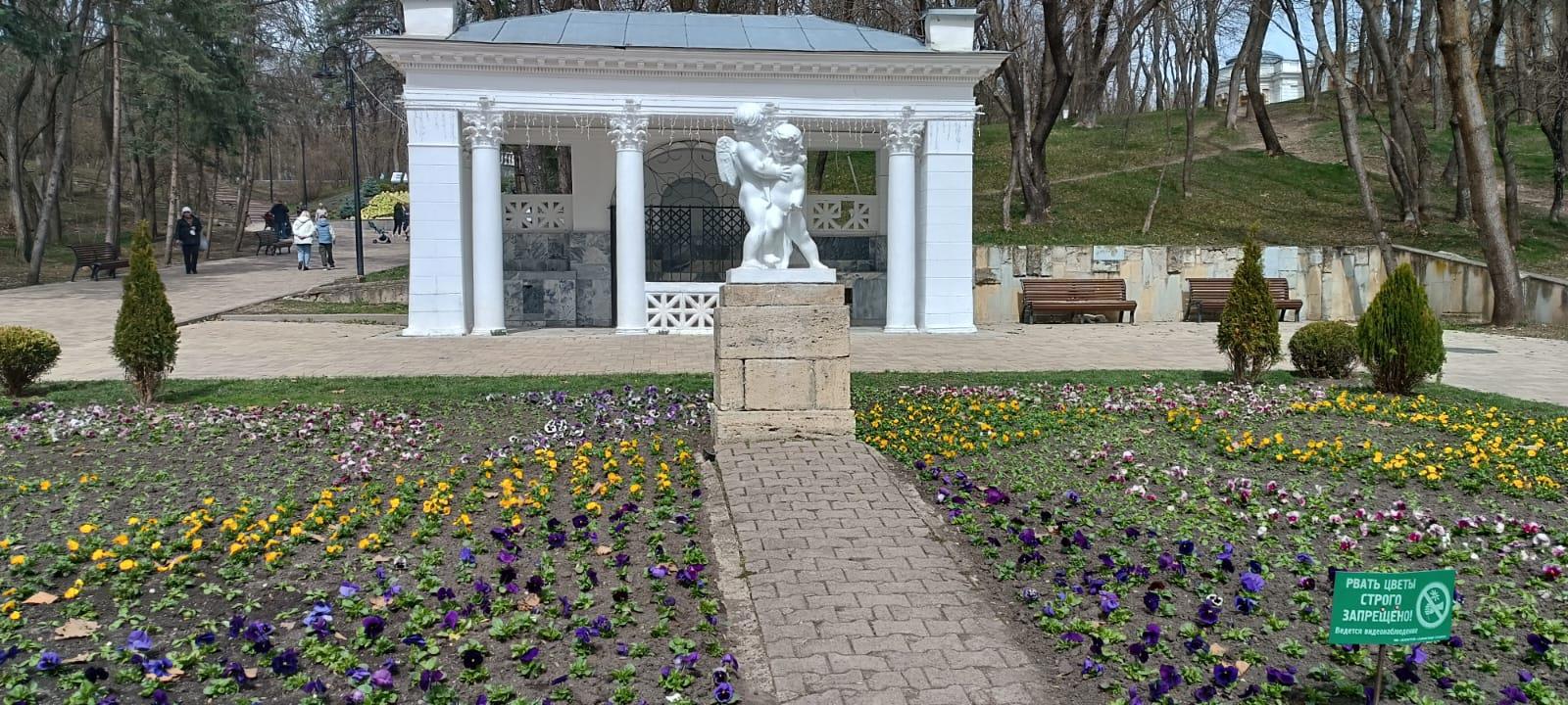 На этой клумбе уже высадили "анютины глазки". но как-то скромно совсем. Это был один из первых бюветов с минеральной водой. Сейчас он не работает. А постройка осталась. Все первые бюветы были с колоннами. Видимо, это тогда было очень модно.