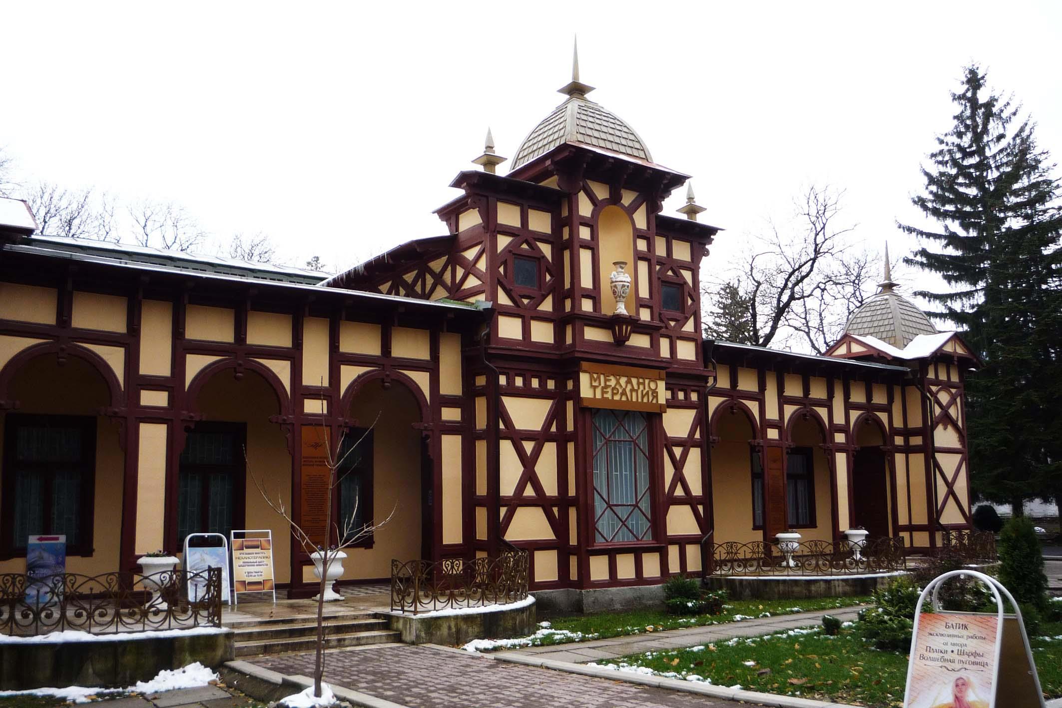 А это здание Механотерапии. Вот такой винтаж в современных Ессентуках. Построено в 1902 году и стало сразу весьма популярным. По периметру здания расположены кабинеты врачей. А в центре, в зале стоят тренажеры. И все здесь, как в прежние времена. Именно на этих аппаратах больше века назад упражнялись мужчины во фраках и дамы в пышных платьях. Спортивных костюмов тогда было не найти, и дамам разрешалось ослабить корсет.