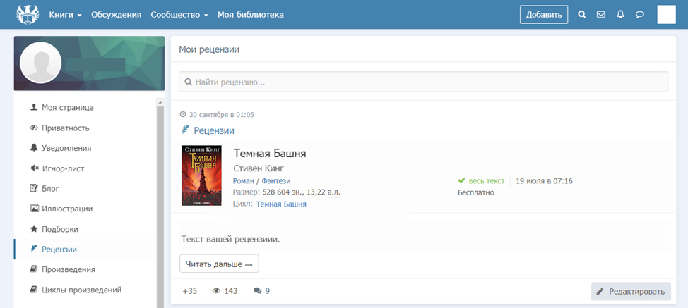 В данном разделе доступно управление всеми написанными вами рецензиями, а также реализован поиск по названию произведения или тексту рецензии.