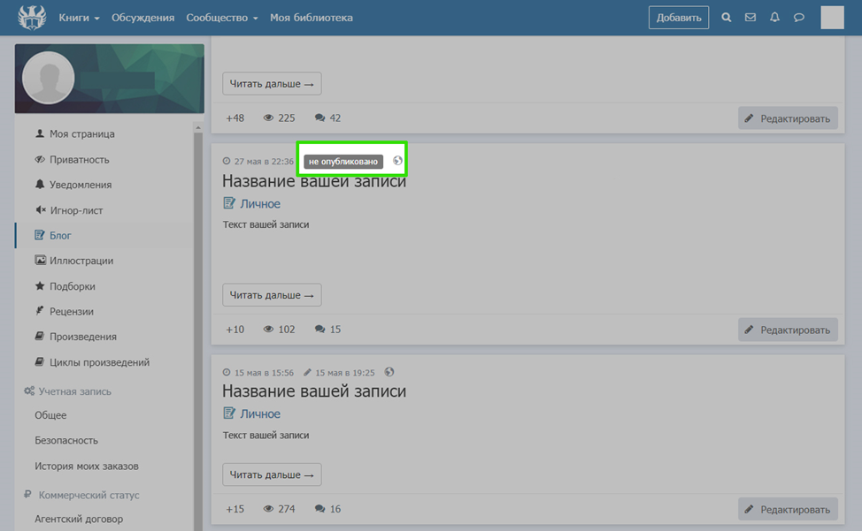 Метка «Не опубликовано» рядом с названием блога говорит о том, что данная запись не видна никому, кроме вас.