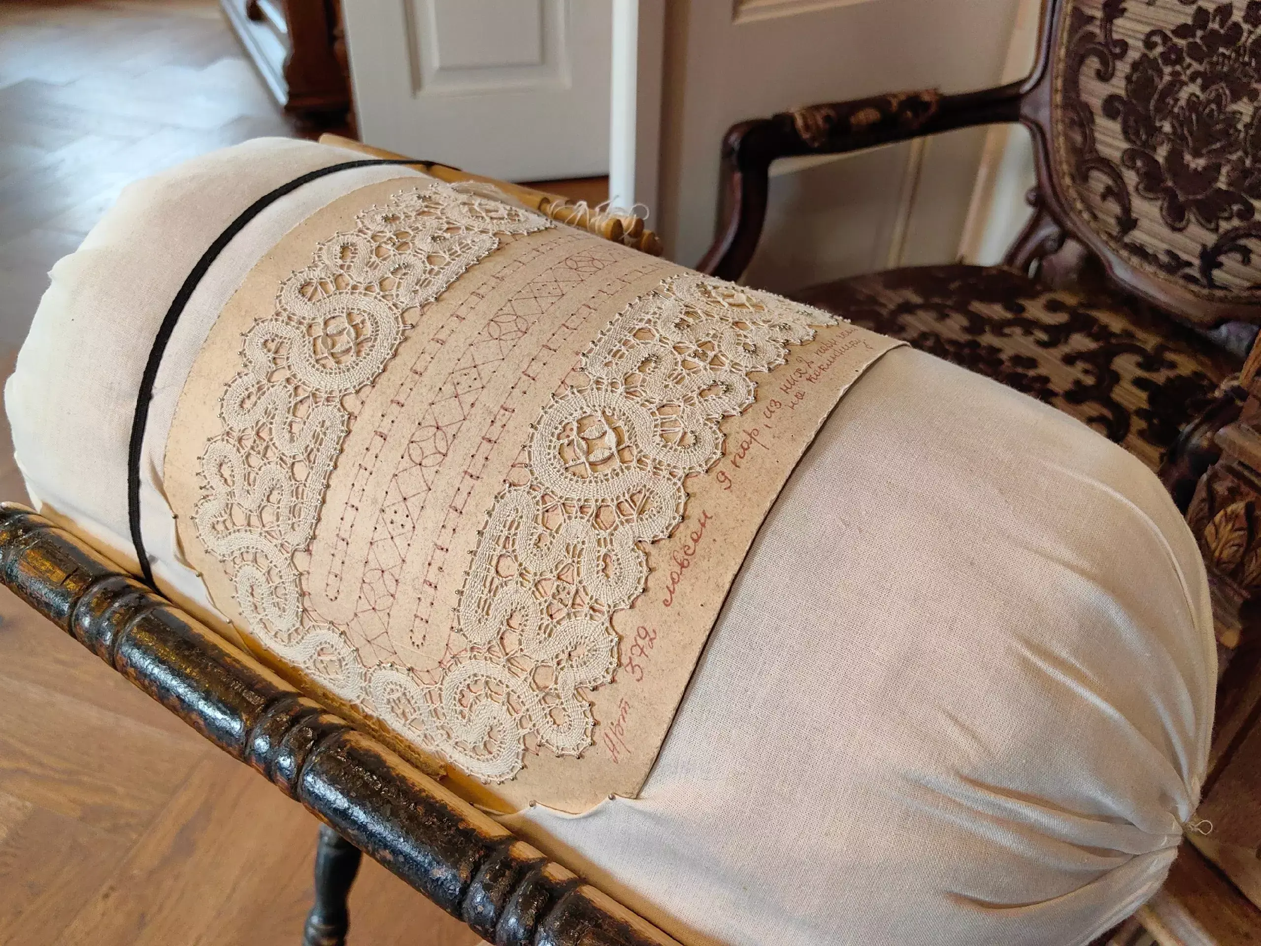 Кружево, прикрепленное к сколку, на валике, который лежит на пяльцах (подставке).