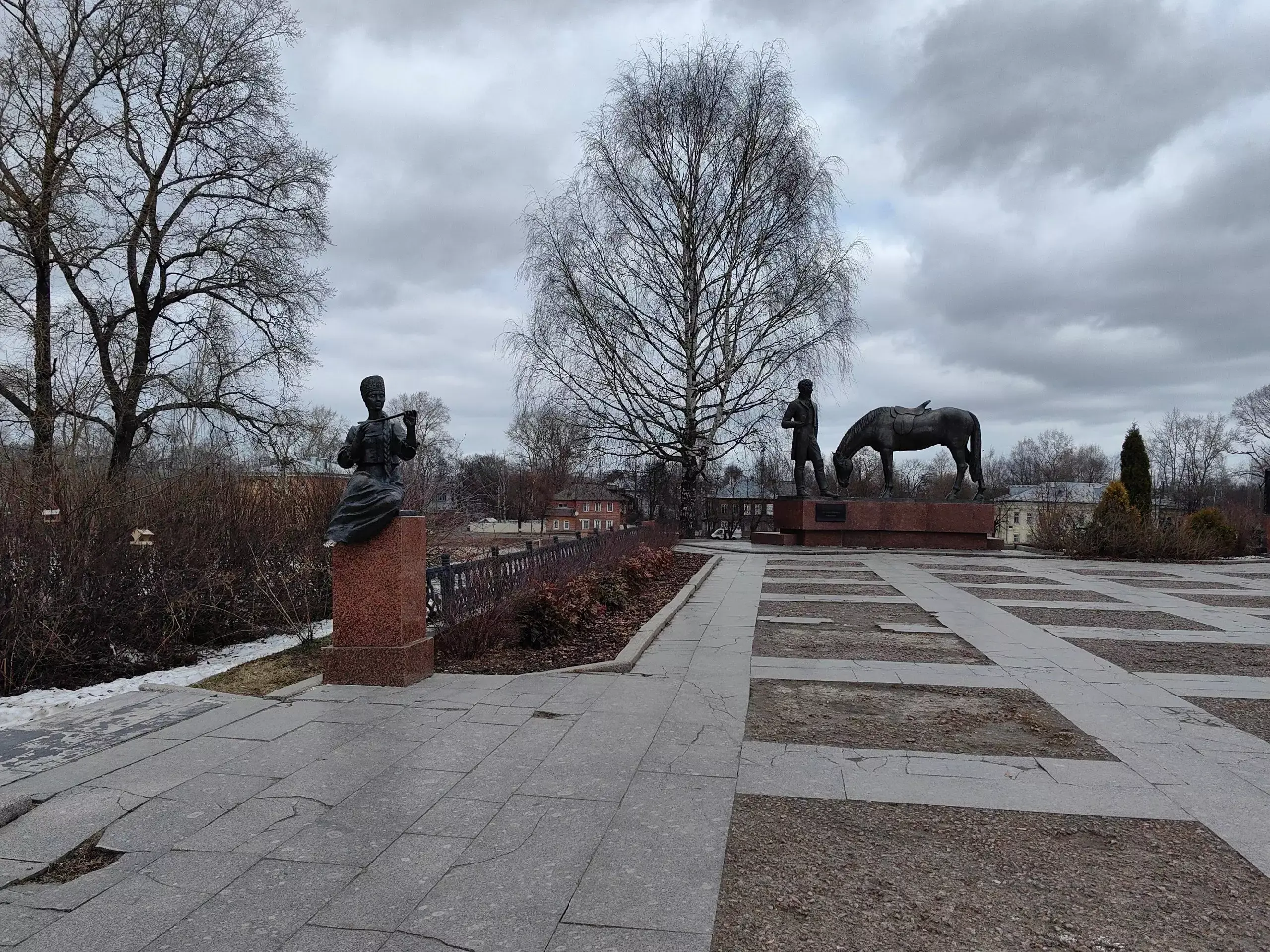 Памятник поэту пушкинской поры Константину Батюшкову (справа) и фигура девушки, которой все трут башмак (слева).
