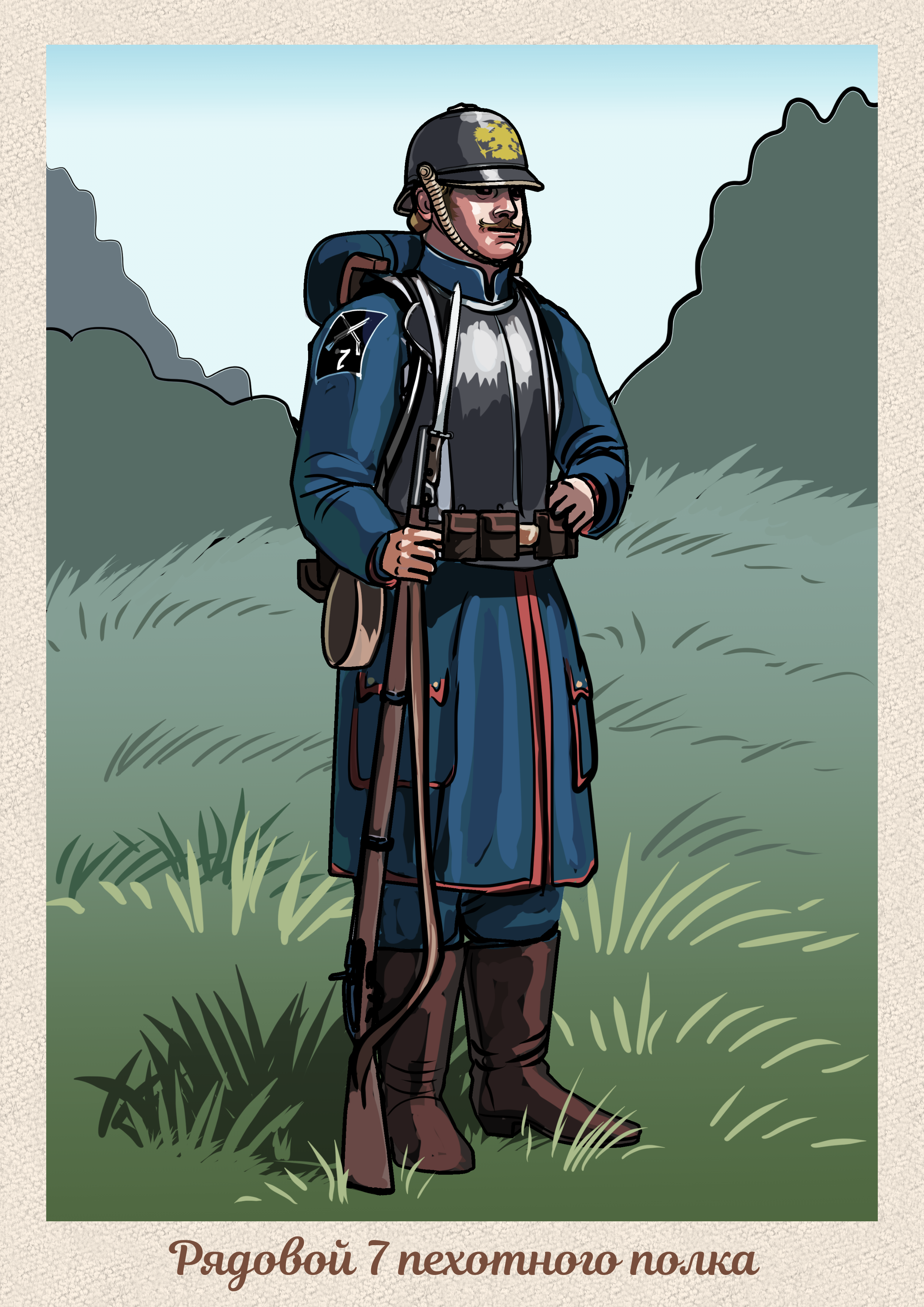 На голове новый тип стального шлема, а на корпусе - стальная полукираса. В руках - нарезная, заряжаемая с казны винтовка с затвором типа Крнка и штык-ножом аналогичным тому, что был у маузера.