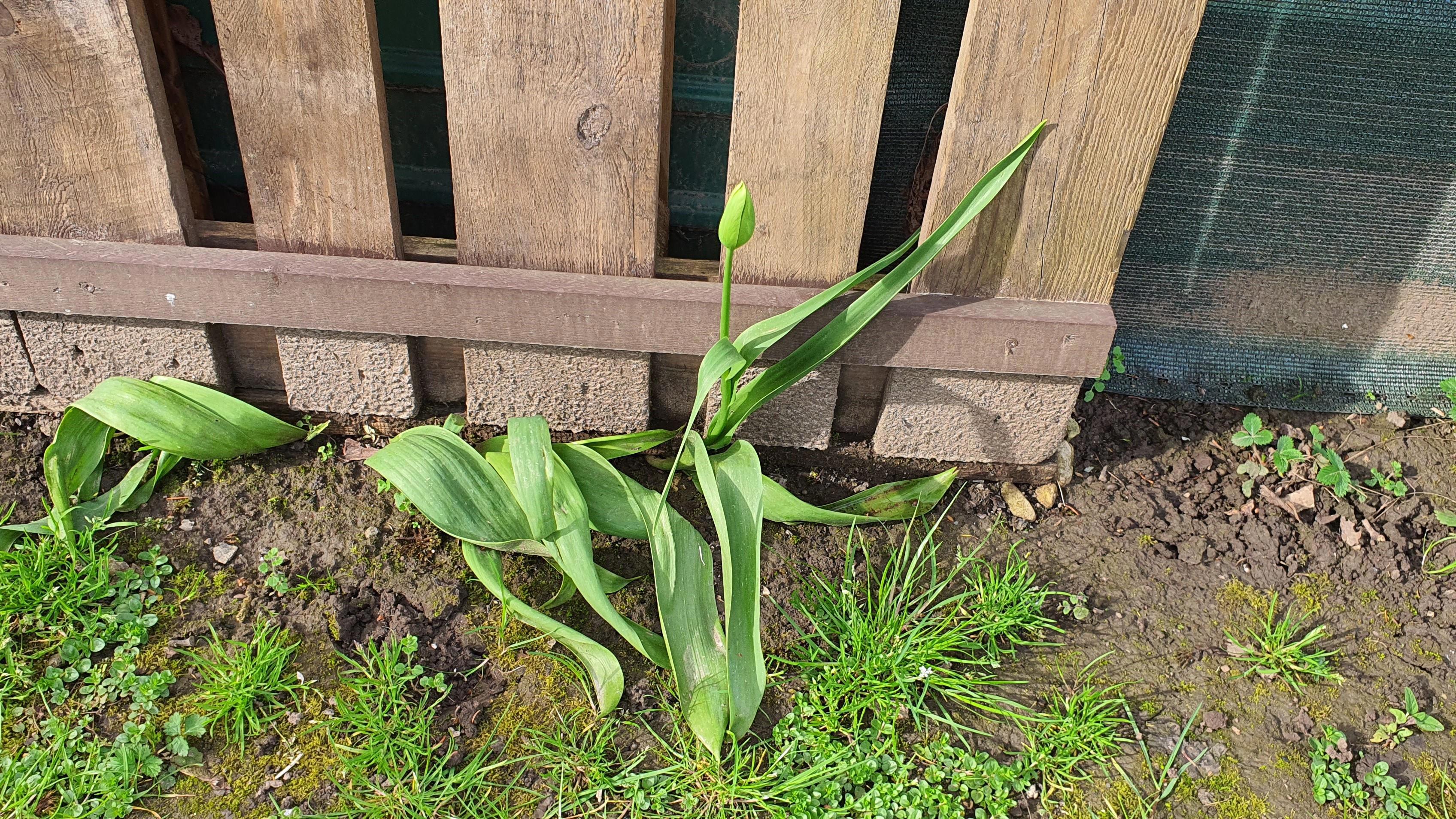 Тюльпаны, где надо не цветут, а где не надо, пробили себе дорогу. Аж из-под забора вылезли.