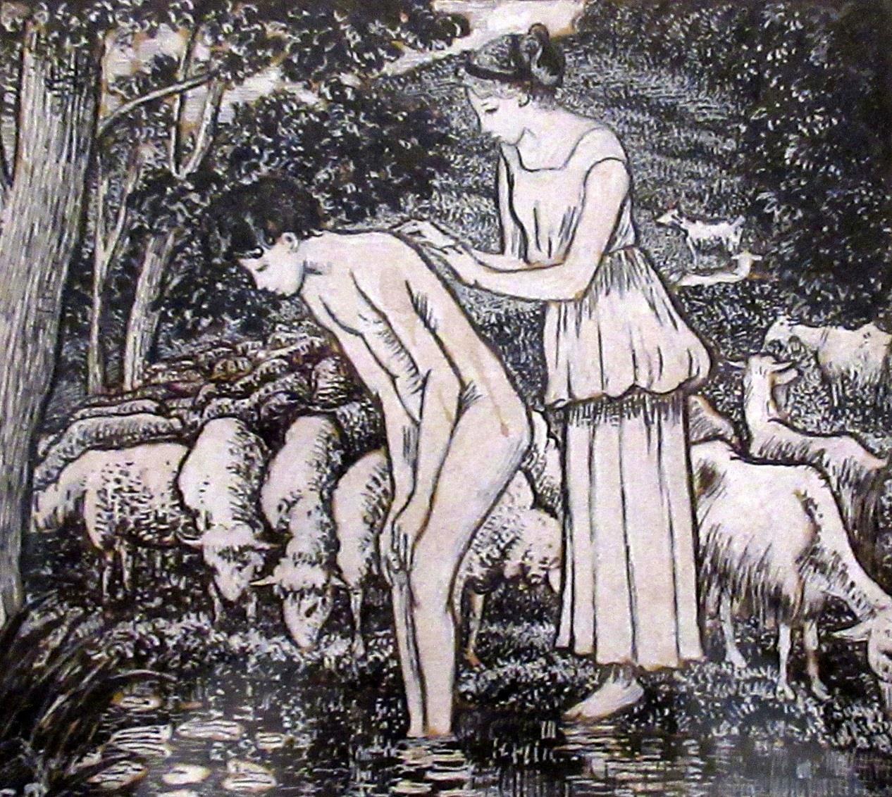 Вот здесь как раз они походят на себя самих из романа. Сцена, когда Хлоя первый раз видит Дафниса голеньким и трогает его кожу. Как переданы состояния обоих подростков и снова... животные! Овцы - абсолютно живые и точно в соблюденных пропорциях и движении.
