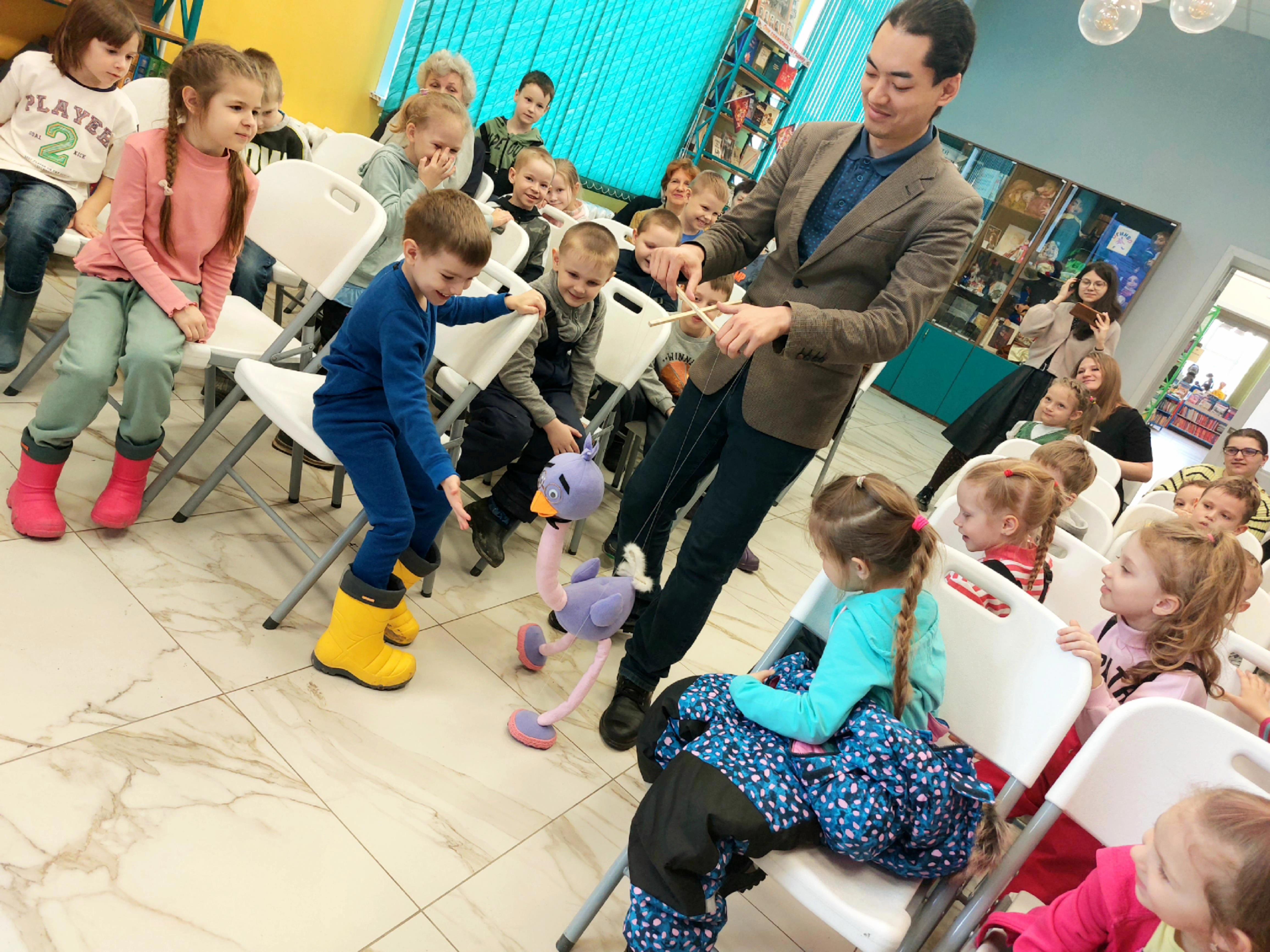Кроме нас был ещё Олег Сорокин (актёр театра "Викторий", сын Ирины), что очень эффектно появился в зале, под шумный восторг детворы, вместе с шагающим страусёнком - куклой-марионеткой