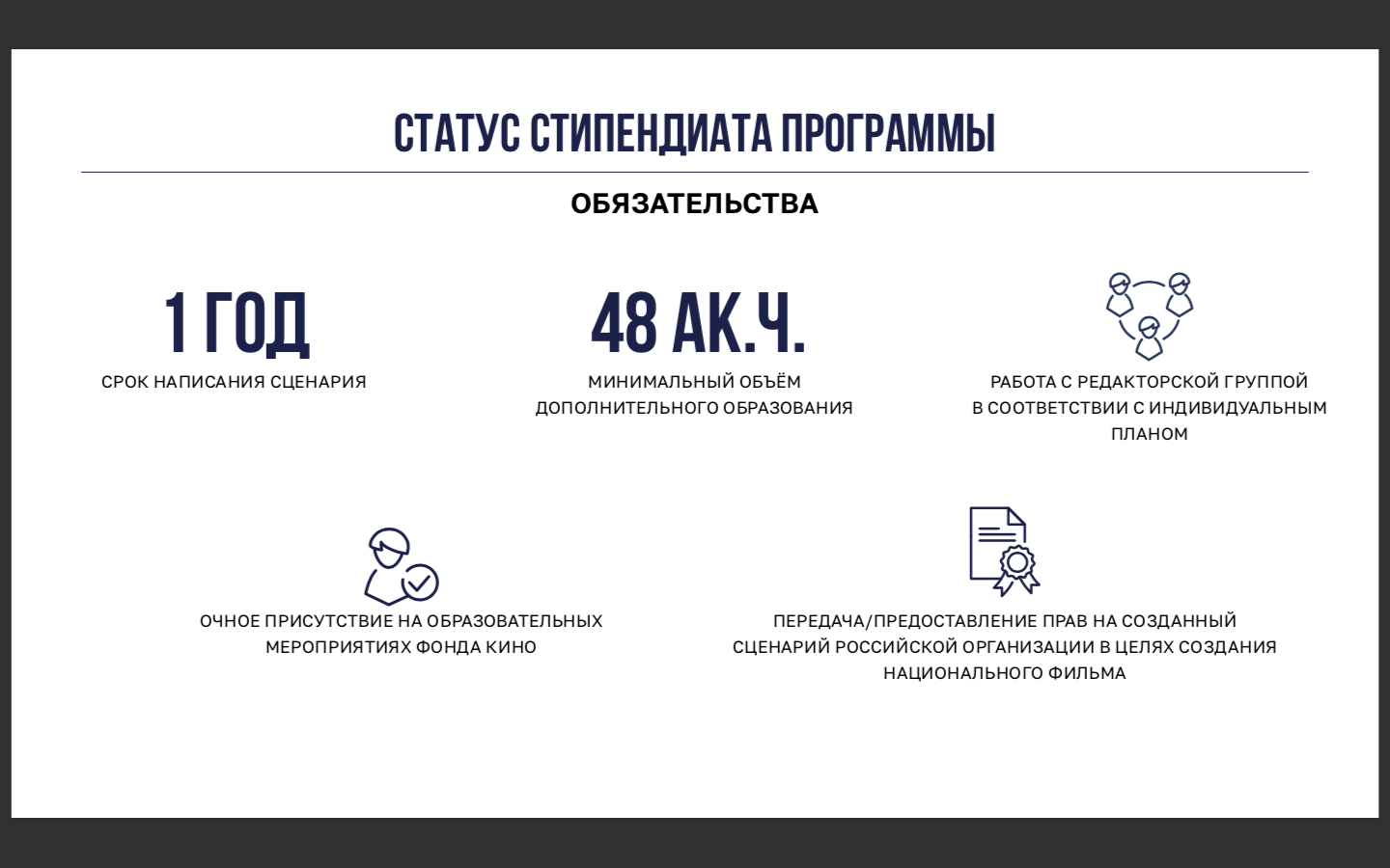 Чтоб начинающим сценаристам было чем питаться в это непростое время, ФК назначает им (и стало быть, мне) стипендию в размере 150 000 рублей за вычетом НДФЛ. Кроме того, оплачивает год обучения в любой отечественной киношколе по драматургическому профилю. Кроме того, после написания все права на сценарий остаются за автором, а ФК к тому же осуществляет всестороннее сопровождение сделки по продаже этого сценария киностудии. Единственное и главное условие – киностудия должна быть Российской (с Оскаром придется повременить). То есть, талантливый человек, написавший хороший сценарий, через год получит еще и денег за рыночную стоимость своей истории.