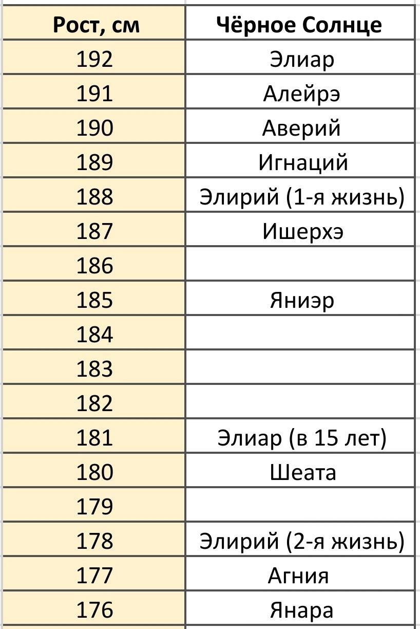 Автор: Наталья КорневаЕсть у меня вот такая табличка с ростом героев «Чёрного Солнца»: