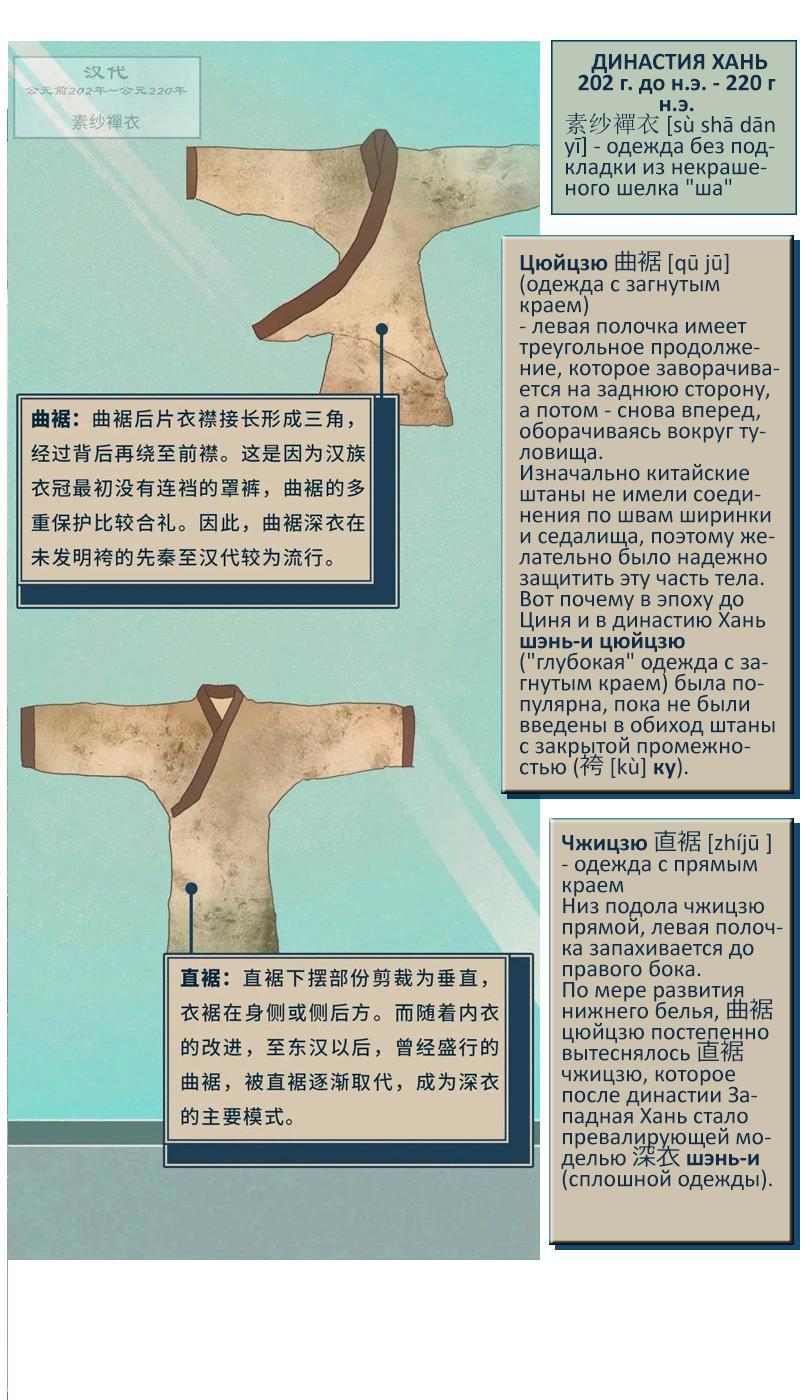 Вот почему в эпоху до Циня и в династию Хань шэнь-и цюйцзю ("глубокая" одежда с загнутым краем) была популярна, пока не были введены в обиход штаны с закрытой промежностью (袴 [kù] ку).