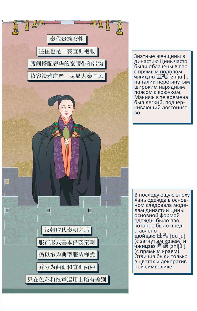 Знатные женщины в династию Цинь часто были облачены в пао с прямым подолом чжицзю 直裾 [zhíjū ] , на талии перетянутым широким нарядным поясом с крючком. Макияж в те времена был легкий, подчеркивающий достоинство.