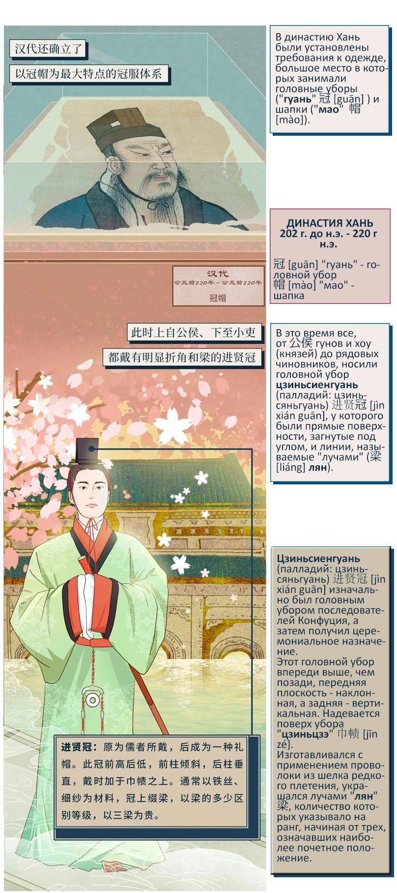 В династию Хань были установлены требования к одежде, большое место в которых занимали головные уборы ("гуань" 冠 [guān] ) и шапки ("мао" 帽 [mào]).