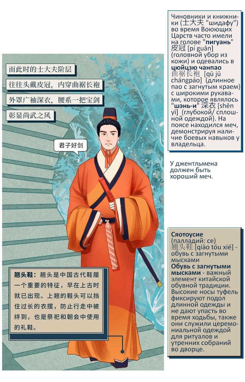 Чиновники и книжники (士大夫 "шидафу") во время Воюющих Царств часто имели на голове "пигуань" 皮冠 [pí guān] (головной убор из кожи) и одевались в цюйцзю чанпао 曲裾长袍 [qū jū chángpáo](длинное пао с загнутым краем) с широкими рукавами, которое являлось "шэнь-и" 深衣 [shēn yī] (глубокой/ сплошной одеждой). На поясе находился меч, демонстрируя наличие боевых навыков у владельца.