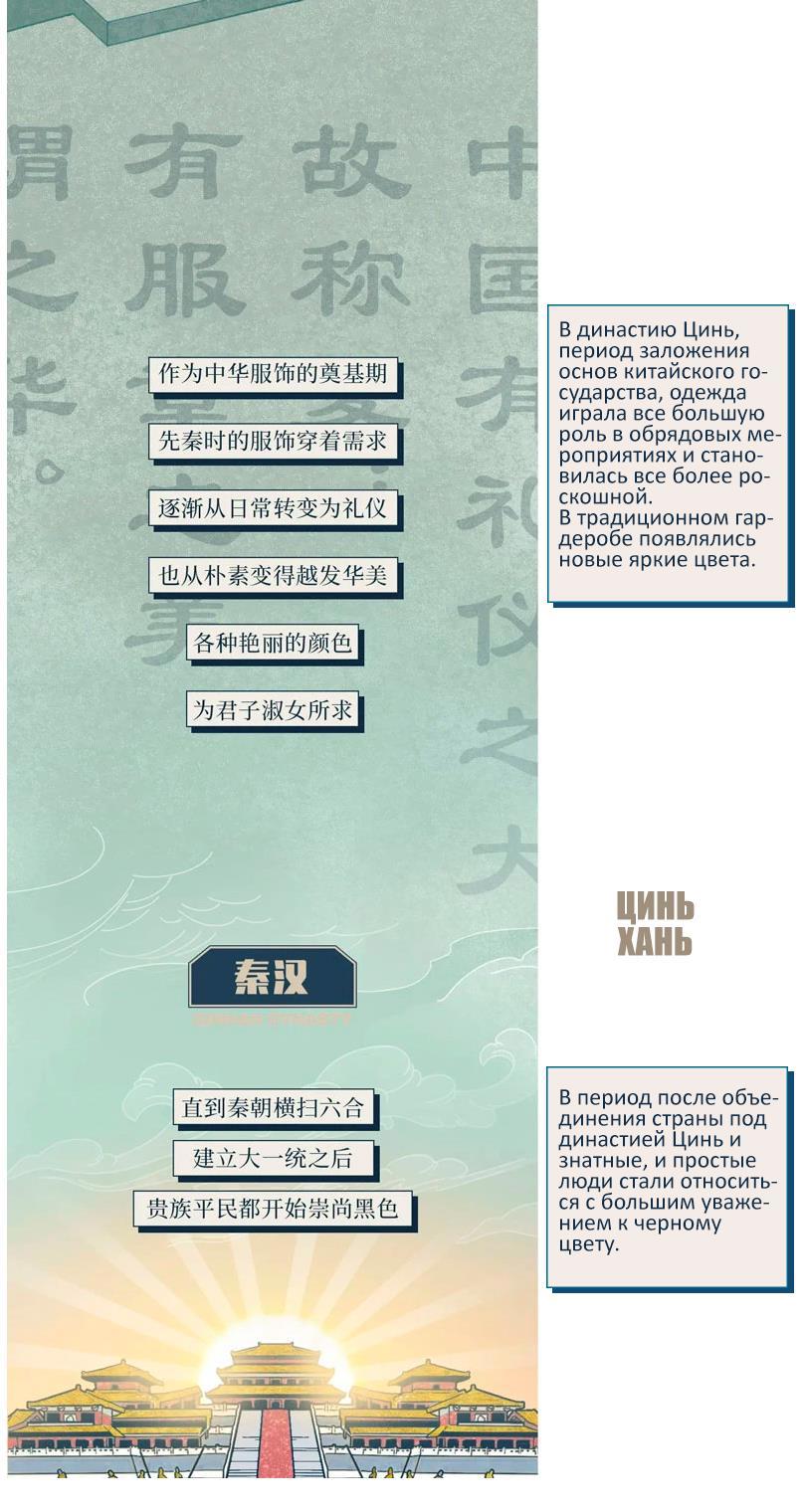 В династию Цинь, период заложения основ китайского государства, одежда играла все большую роль в обрядовых мероприятиях и становилась все более роскошной. В традиционном гардеробе появлялись новые яркие цвета.