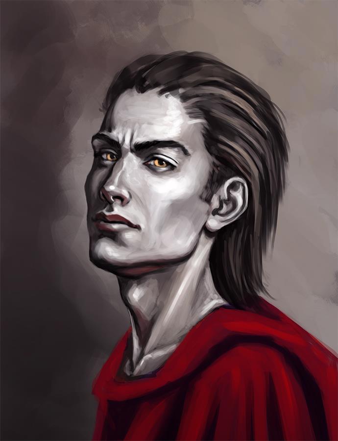 Мужчина, высокий, носит бордовую мантию весьма свободного покроя. Волосы темно-коричневые, до плеч, кожа бледная, глаза светло-карие, янтарные. Лицо не слишком симпатичное, но и не оталкивающее, с печатью тяжелого прошлого и коварных планов в настоящем.